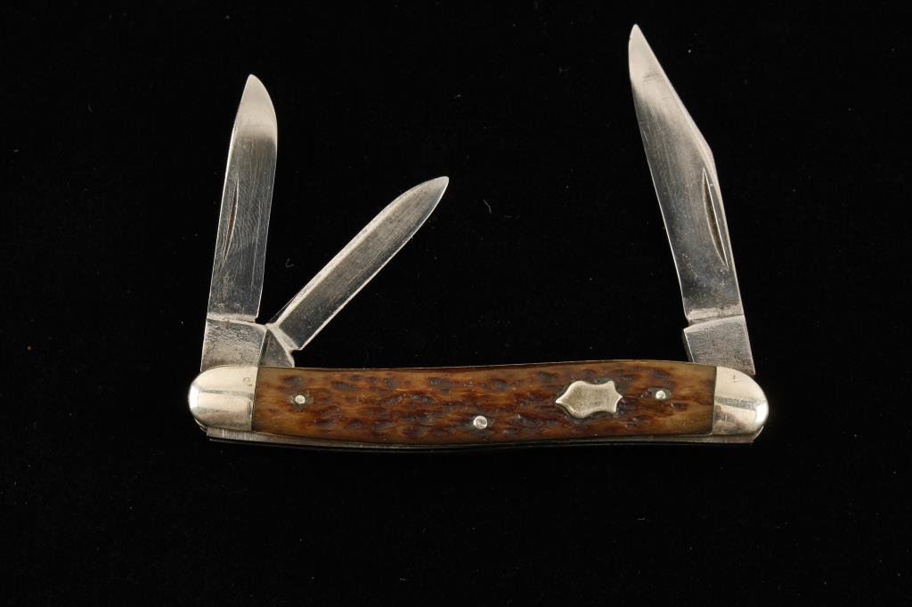 Desirable Winchester 3-blade pocket knife (largest blade numbered 3967) with stag slabs, approximately 3.5” overall closed; in very good condition showing areas of old pinprick pitting on blades that have been polished and cleaned long ago. Est.: $50-$150.