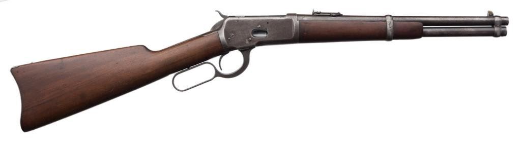 **Desirable Winchester Model 1892 Trapper’s saddle ring carbine, .38-40 caliber, 14” barrel, S/N 333449, blued finish, wood stocks in overall very good condition showing grey patina with original blue on barrel and loading tube in protected areas as well as some traces of original blue on the receiver in protected spots; very good bore, crisp action, sharp markings and very good to fine wood stocks. Accompanied by both an original factory letter & ATF approval document. The factory letter confirming features and indicating receipt in warehouse on August 27, 1906 and shipment of the gun on October 4, 1906 to order number 66708; the ATF approval letter as a curio and relic dated Sept. 22, 2005. Est.: $5,000-$10,000.