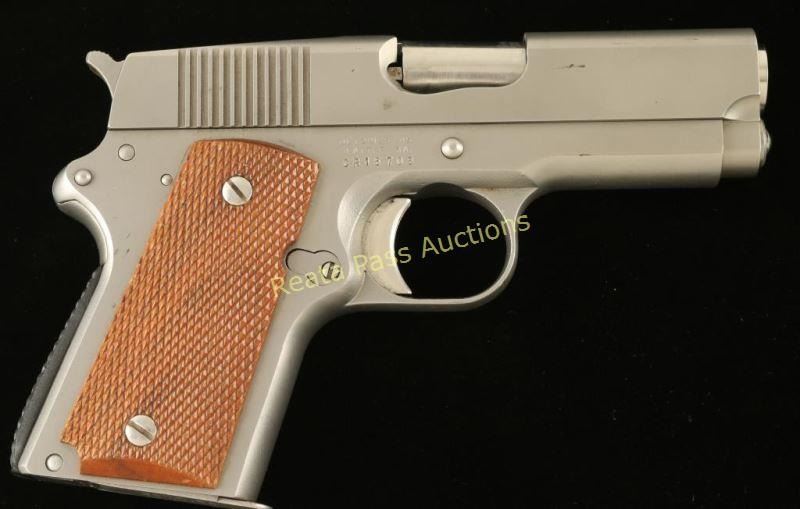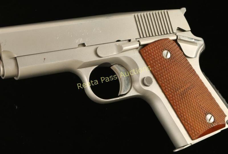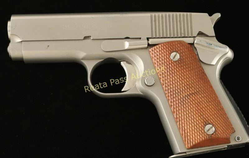 Innovative compact single-action semi automatic pistol chambered in .45 Automatic, produced in Seattle, Washington. Detonics pistols have a long and interesting history revolving around the compact 1911 format. Features a matte stainless steel finish, 3.5" barrel, flat-top slide with no provisions for sights, serrated trigger & hammer spur, thumb safety, push button magazine release, 6 round magazine, checkered mainspring housing, bobbed beavertail and two-piece checkered wood grips. Pistol exhibits few scuffs and a couple dark spots on the slide. The hammer shows some rust stains. Action is crisp, bore is very good and wood grips are fine. This model is rumored to have been developed for the C.I.A. and is believed to be the predecessor for the modern 'carry melt' style conceal carry pistols. Condition is near excellent. ***Modern Firearm***