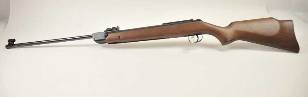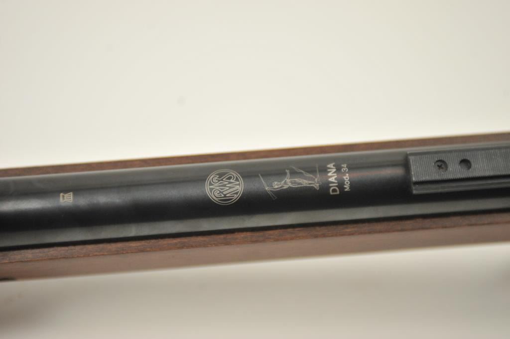Diana Model 34 air rifle, .22 caliber, Serial #01175613. The rifle is in nearly excellent overall condition with a 19” barrel with a hooded front and adjustable rear sights. The smooth wood stock is in very good conditionwith only light handling marks. The rifle is working well at the time of description. Est.: $150-$300.