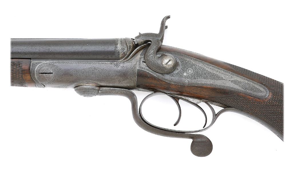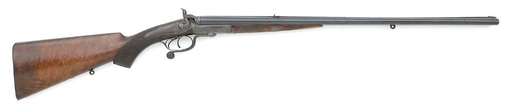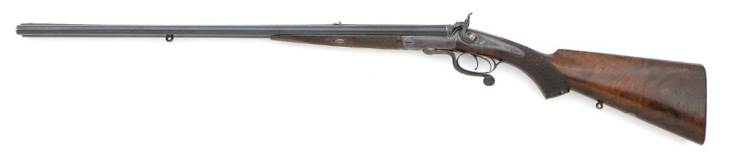 serial #3559, 360 Express (2 1/4'' Case), 25 7/8" barrels with mostly bright very good bores showing some scattered small areas of light pitting or oxidation and otherwise strong Henry patent rifling throughout. This Jones underlever rifle is of the lovely quality we would expect from this maker, considered by many to be one of the world's finest, and is a rather diminutive and attractive size with the proportions being scaled perfectly to the cartridge for which it is chambered. The rifle remains in nice honest condition with its barrels retaining about 70% evenly thinning original blue blending with a smooth brown patina and showing some light handling marks and oxidation speckles. Top of barrel rib is engraved "JAMES WOODWARD & SONS 64 ST. JAMES STREET LONDON" and the rib shows very nice fine filed matting. The action and locks are a lovely smooth gray-brown patina with strong, generous traces of original case-hardened colors in the protected areas. The frame and back action locks feature lovely tight English scroll engraving in about 60% coverage. Each lock is engraved "J. WOODWARD & SONS" and locks features non-rebounding hammers. The checkered pistolgrip walnut buttstock and splinter forend are of nicely figured walnut and rate near excellent with a touch of older added finish and strong checkering showing the expected light dings and handling marks, the forend with a bit more wear. Rifle features a steel shotgun buttplate which is nicely stippled with engraved borders around screws and engraved triggerguard tang which terminates at the horn pistolgrip cap that shows a small repaired flake along its edge. The original sling eyes are present and the rifle is sighted with 100 yard standing express rear sight with single flip-up 200 yard leaf and platinum lines and a fine plain bead front sight. Wood to metal fit is perfect, the rifle locks up tight on-face and the locks are crisp and seem to function well mechanically. Weight is 6 lbs. 10 1/2 oz. and the arm was made circa 1876. A splendid little best quality London double rifle. (1,13D11739-38) {ANTIQUE} (6000/8000)
