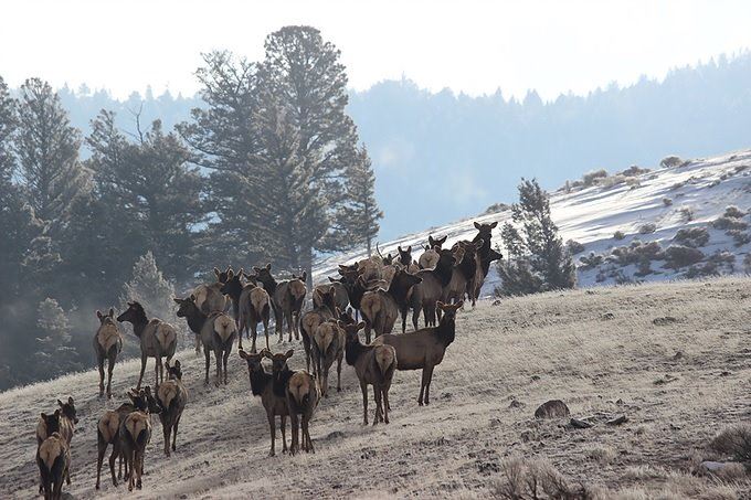 Herds of 3,000, 4,000 head of elk build up in the late fall to winter in areas that are controlled by the park system. The park system is required to not only protect the elk but also the habitat. Elk of this magnitude can be destructive to the habitat with just its travel, let alone what they eat while they are there and traveling. That part is not our problem, we are just the tool used to keep these animals in check so that the tourists can see them in the fall, and not see us controlling the herd number is the fall and winter months. Since this is a population control measure this particular hunt is for cows only.