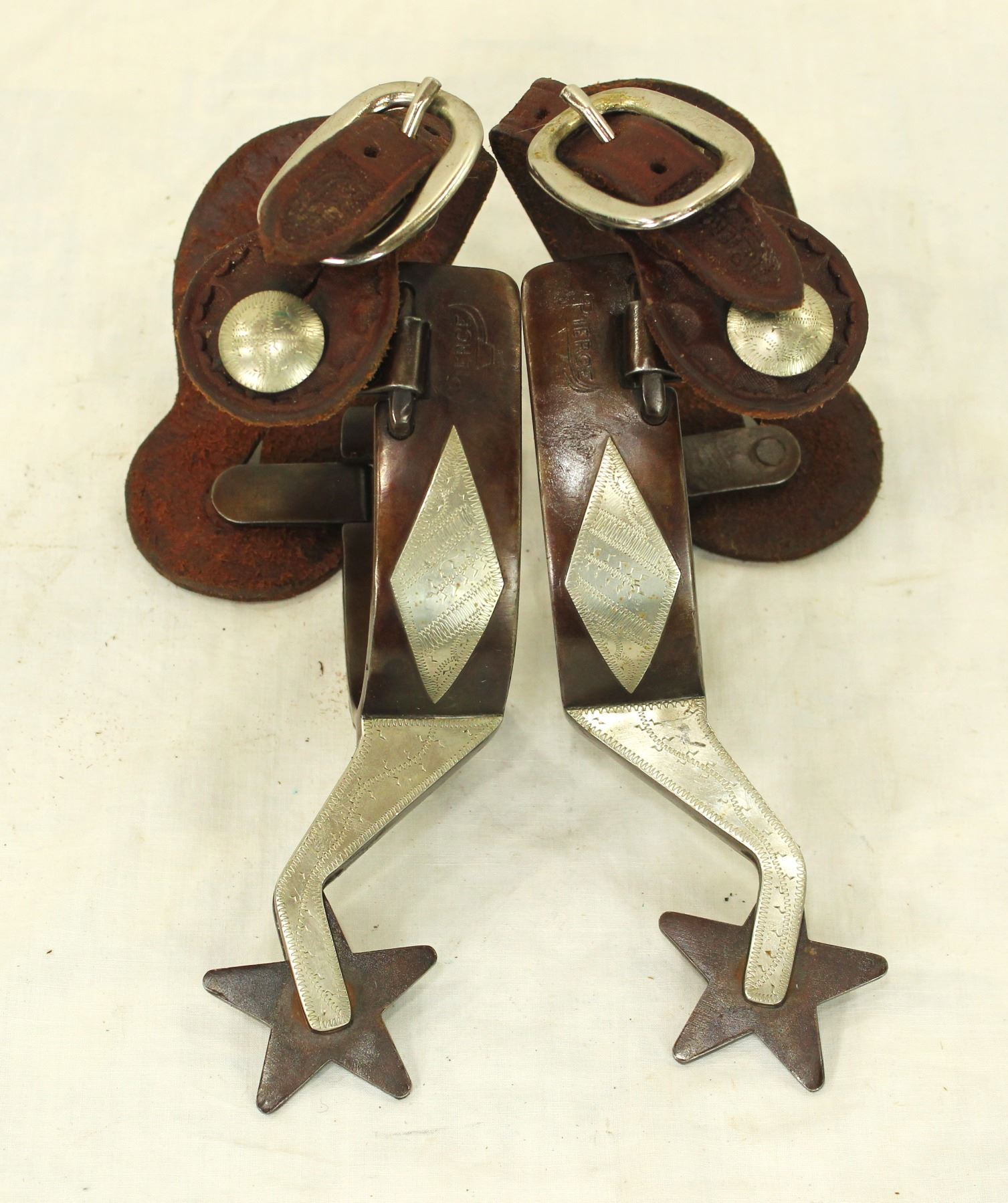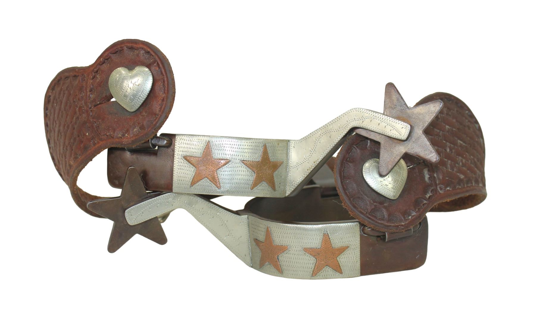 A large pair of Texas style spurs, double mounted with silver and copper star motif. Well marked and completed by a nice pair of straps.
