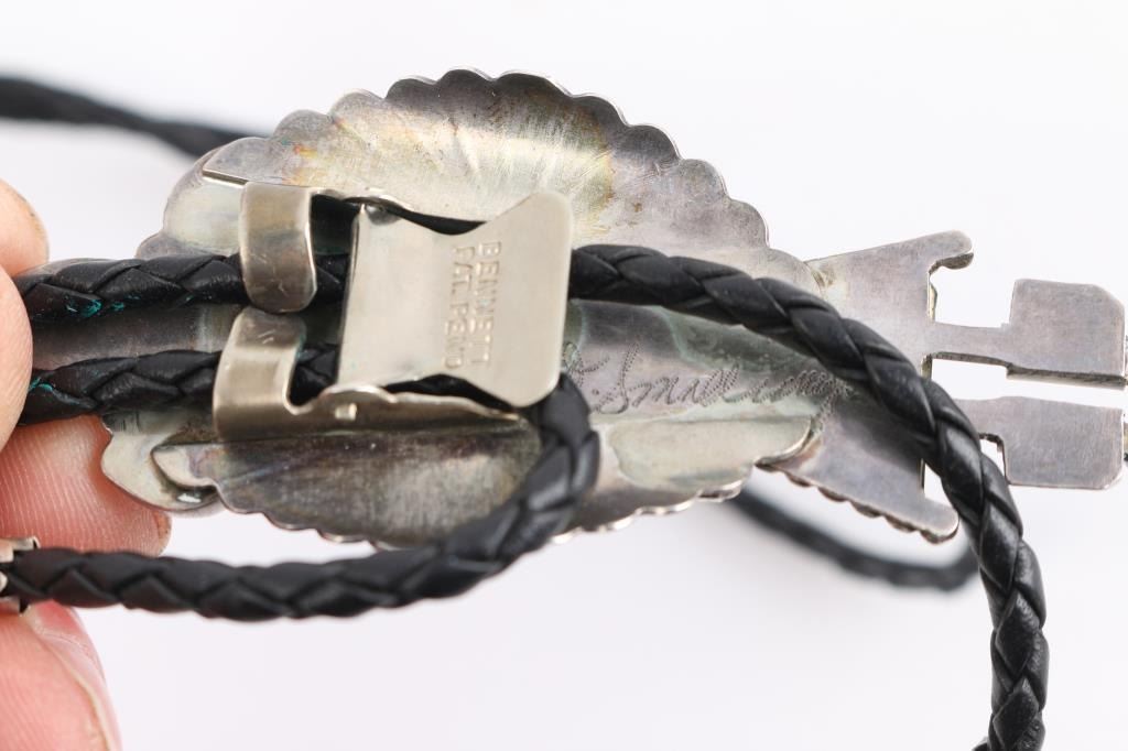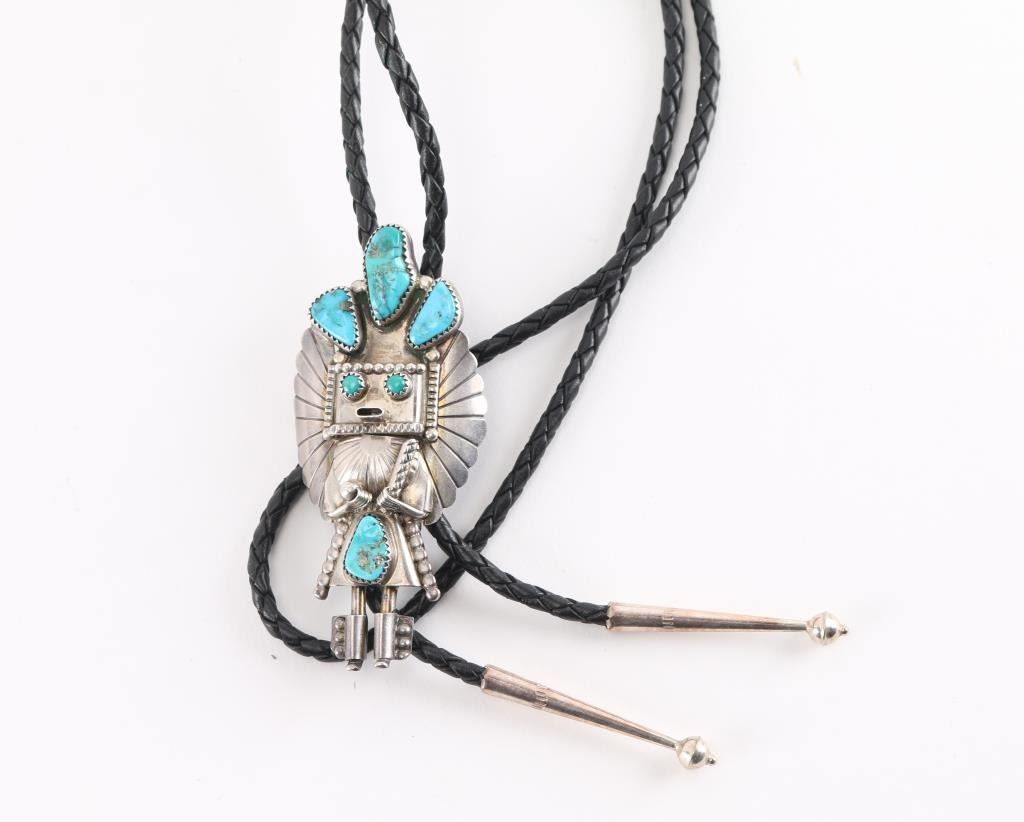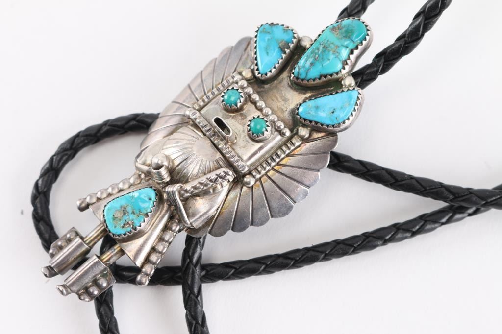 Vintage sterling silver and turquoise kachina bolo tie by Doris Smallcanyon, signed on back. Measures approximately 18".
