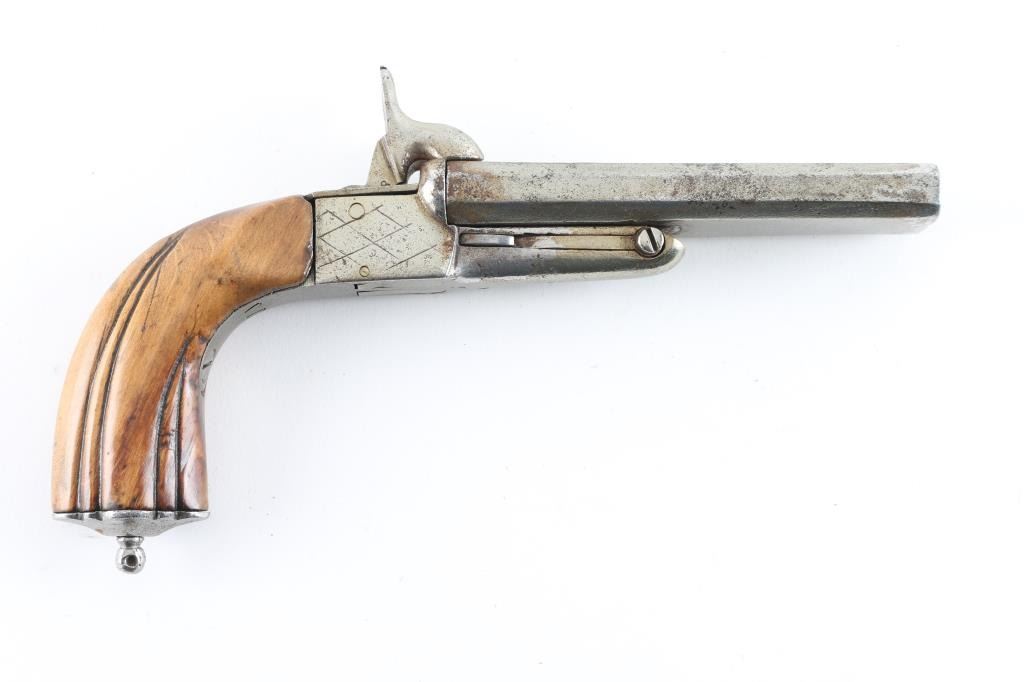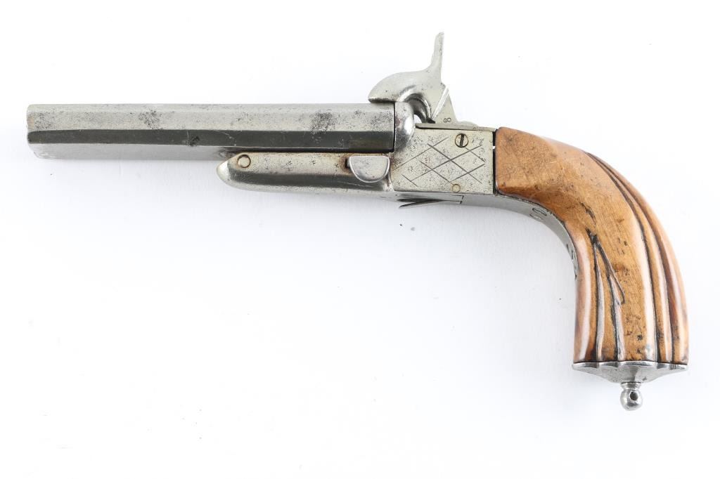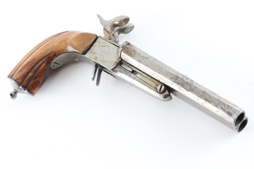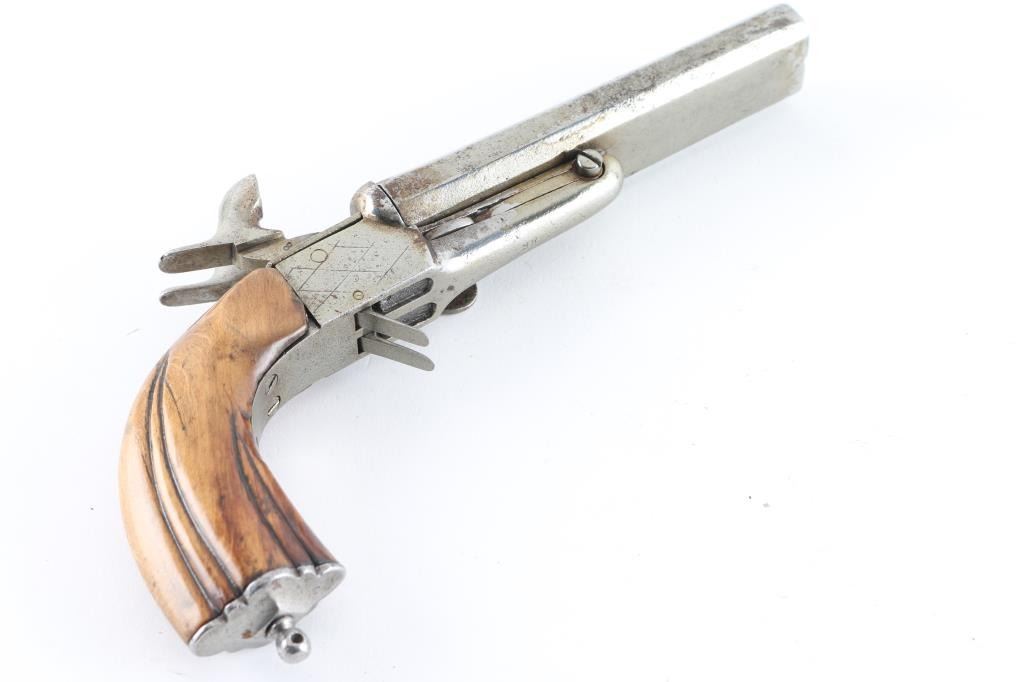 Circa 1850-60's. Type imported during civil war era."9" overall length, approx 10-12mm pinfire, cleaned and stocks "Refreshed" with small losses. Actions work well, Fair to good overall, probably Belguim but no visible indication of origin. Antique Firearm
