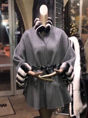 Alaska Fur Gallery has furnished this beautiful reversible wool cape w/chinchilla Rex collar and cuffs.