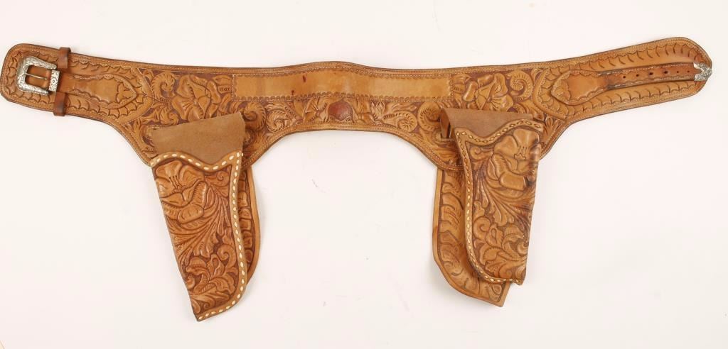 Tan leather tooled in a traditional floral motif size 32.