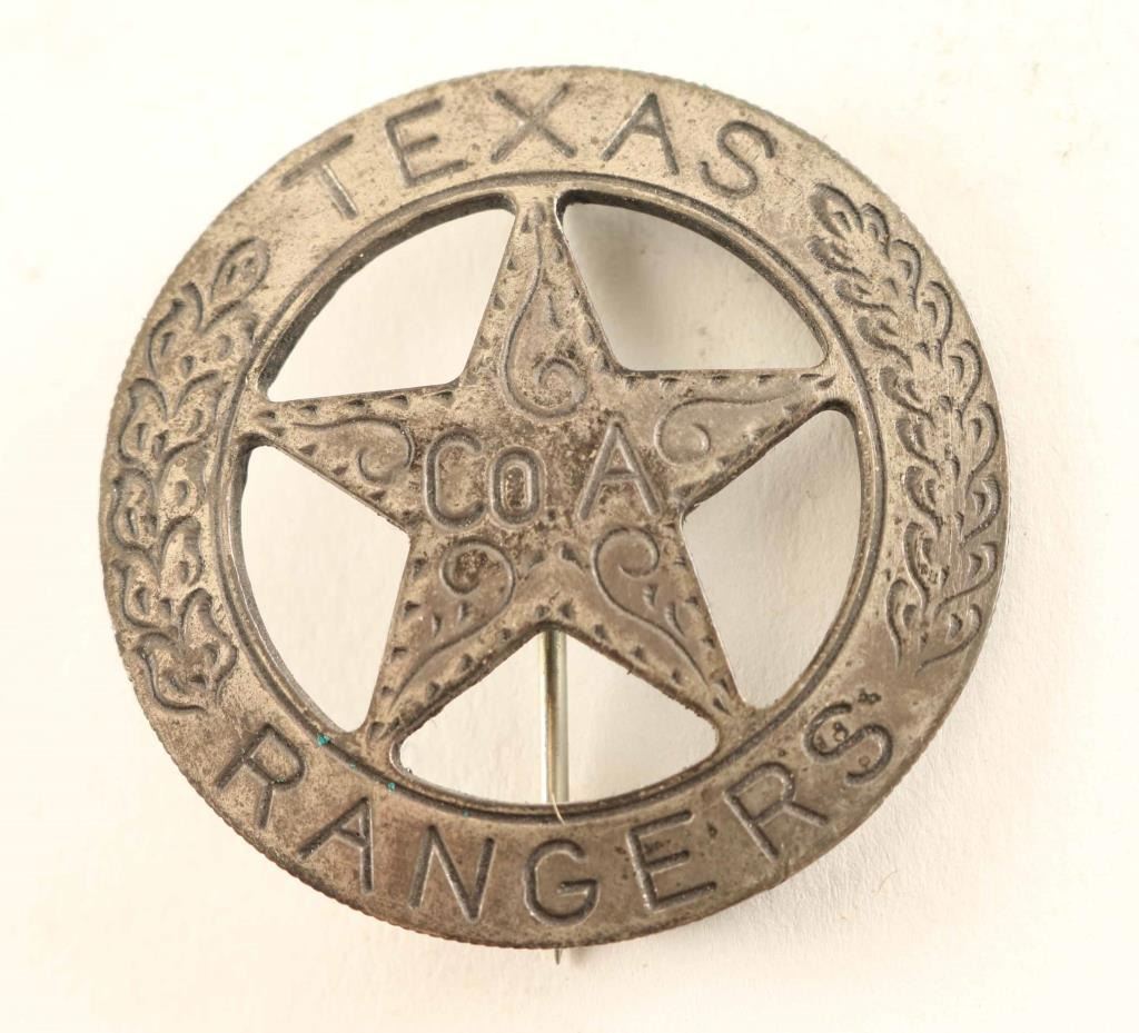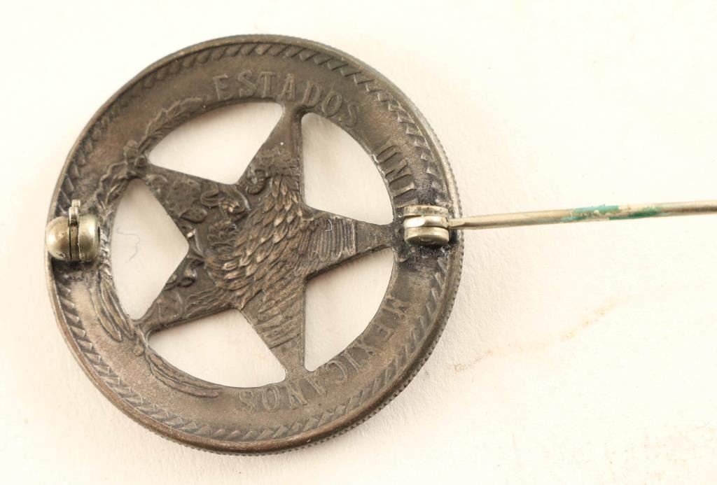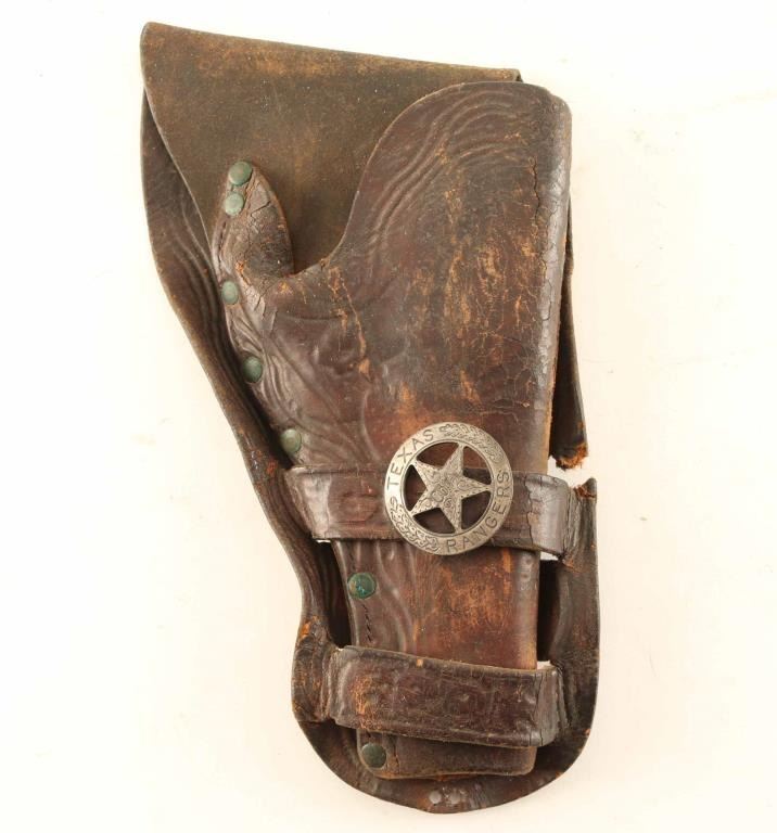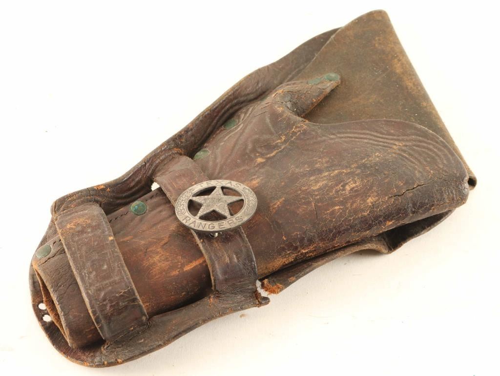 brown leather holster with Texas Ranger badge made from a Mexican coin. Holster has a loss in the loop area.