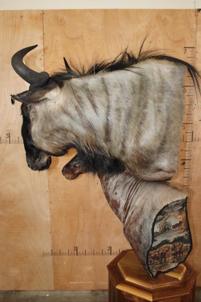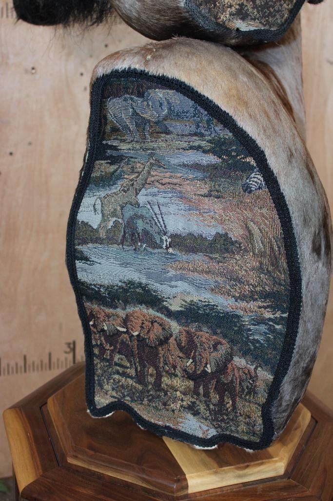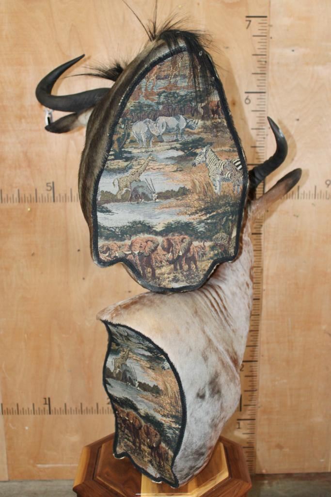 Very Nice and Clean Double Pedestal BLUE WILDEBEEST and TSESSEBE Mount. It features a unique tapestry on the back of both animals depicting a savanna scene with various wildlife like elephants and zebras. It has an octagonal shaped Wood Pedestal, the animals are removable. TAXIDERMY