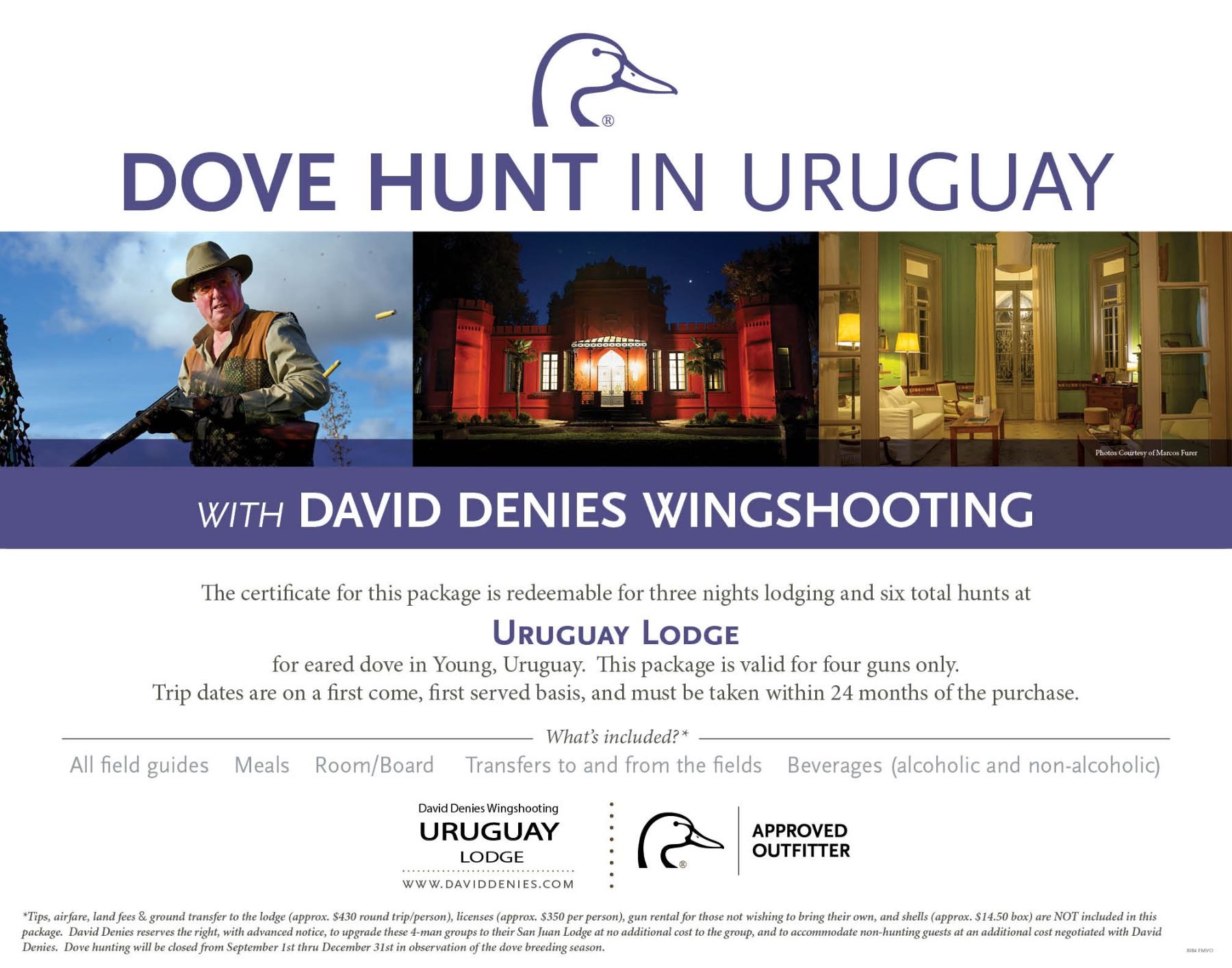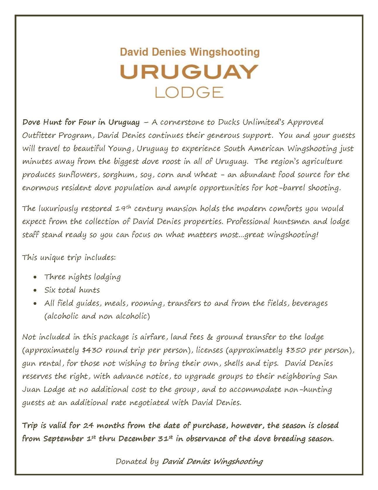 A cornerstone to Ducks Unlimited’s Approved Outfitter Program, David Denies continues their generous support. You and your guests will travel to beautiful Young, Uruguay to experience South American Wingshooting just minutes away from the biggest dove roost in all of Uruguay. The region’s agriculture produces sunflowers, sorghum, soy, corn and wheat - an abundant food source for the enormous resident dove population and ample opportunities for hot-barrel shooting. The luxuriously restored 19th century mansion holds the modern comforts you would expect from the collection of David Denies properties. Professional huntsmen and lodge staff stand ready so you can focus on what matters most…great wingshooting! This unique trip includes: • Three nights lodging • Six total hunts • All field guides, meals, rooming, transfers to and from the fields, beverages (alcoholic and non alcoholic) Not included in this package is airfare, land fees & ground transfer to the lodge (approximately $430 round trip per person), licenses (approximately $350 per person), gun rental, for those not wishing to bring their own, shells and tips. David Denies reserves the right, with advance notice, to upgrade groups to their neighboring San Juan Lodge at no additional cost to the group, and to accommodate non-hunting guests at an additional rate negotiated with David Denies. Trip is valid for 24 months from the date of purchase, however, the season is closed from September 1st thru December 31st in observance of the dove breeding season. Donated by David Denies Wingshooting
