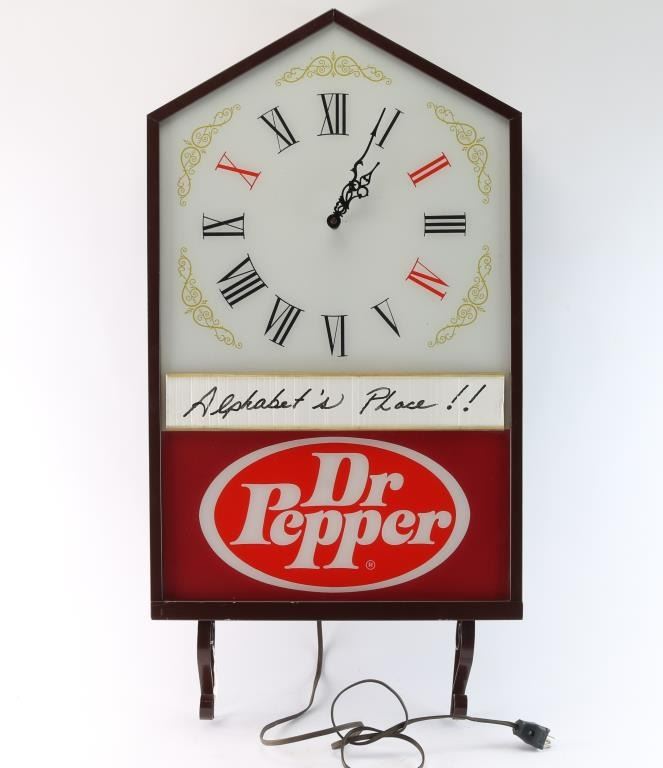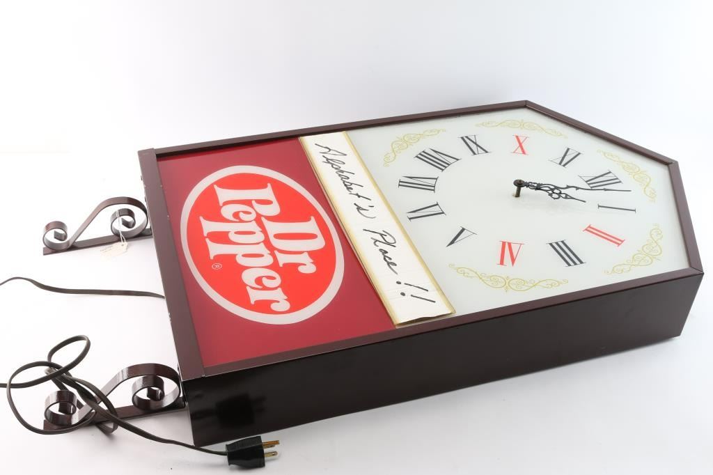 Vintage Dr. Pepper clock sign. Measures 20"W x 40"H. ***Buyer Must Arrange Shipping***