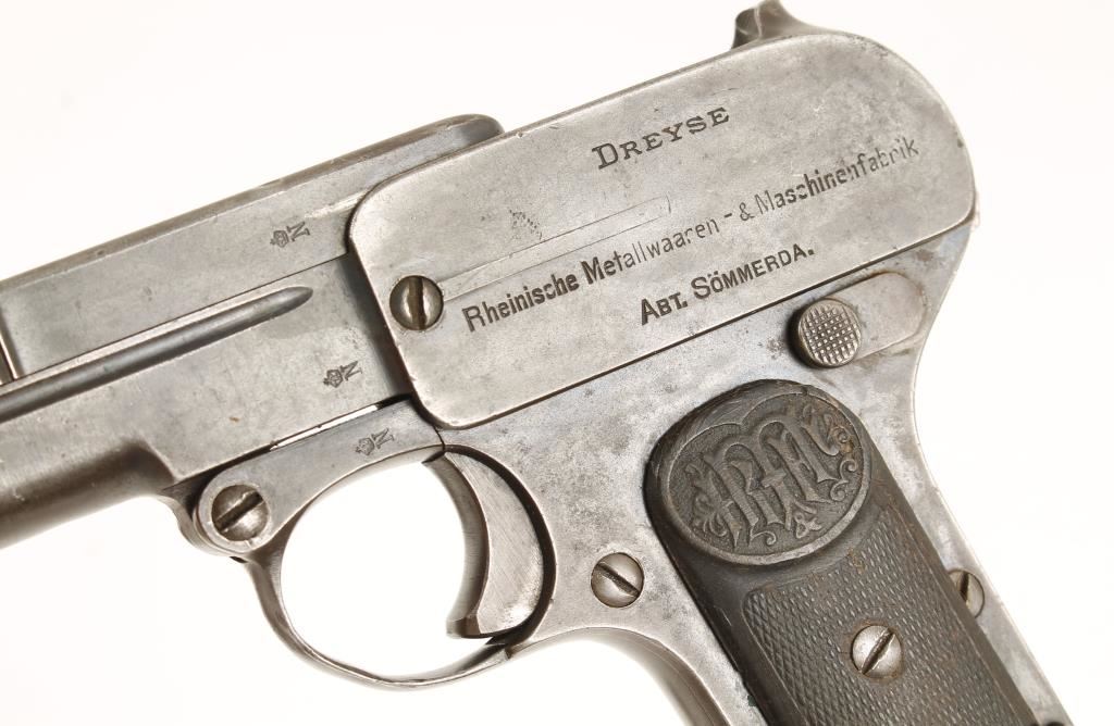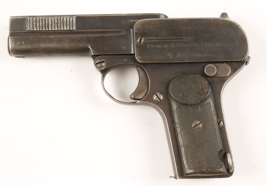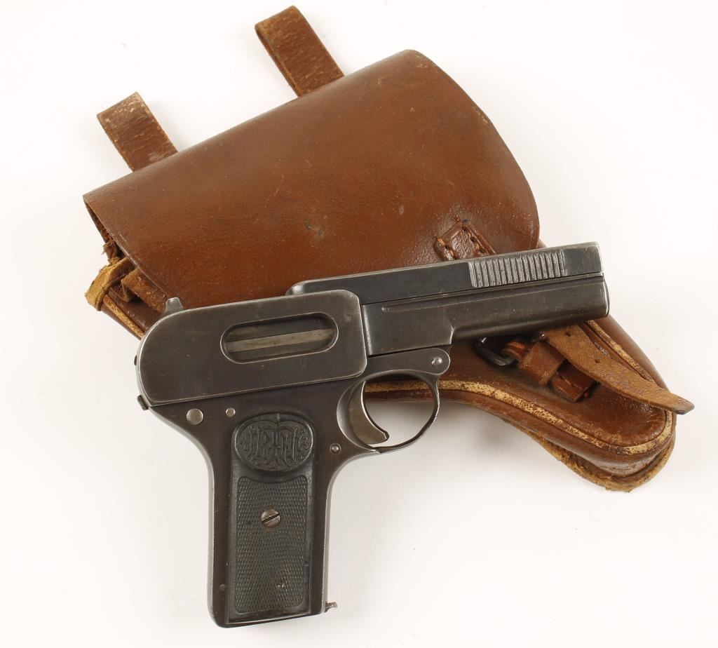 German single action semi-auto hammerless pistol. All steel with hard rubber grips. Original bluing shows holster and edge wear. Roll-stamps are legible as are the Crown over N proofs. There are a few dings on the top and the backstrap. The original grips are worn with a crack on the right one and a few dings and what may be an epoxy patch on the bottom of the left grip. Includes a flap holster and one magazine. Condition is good. *Modern Firearm*