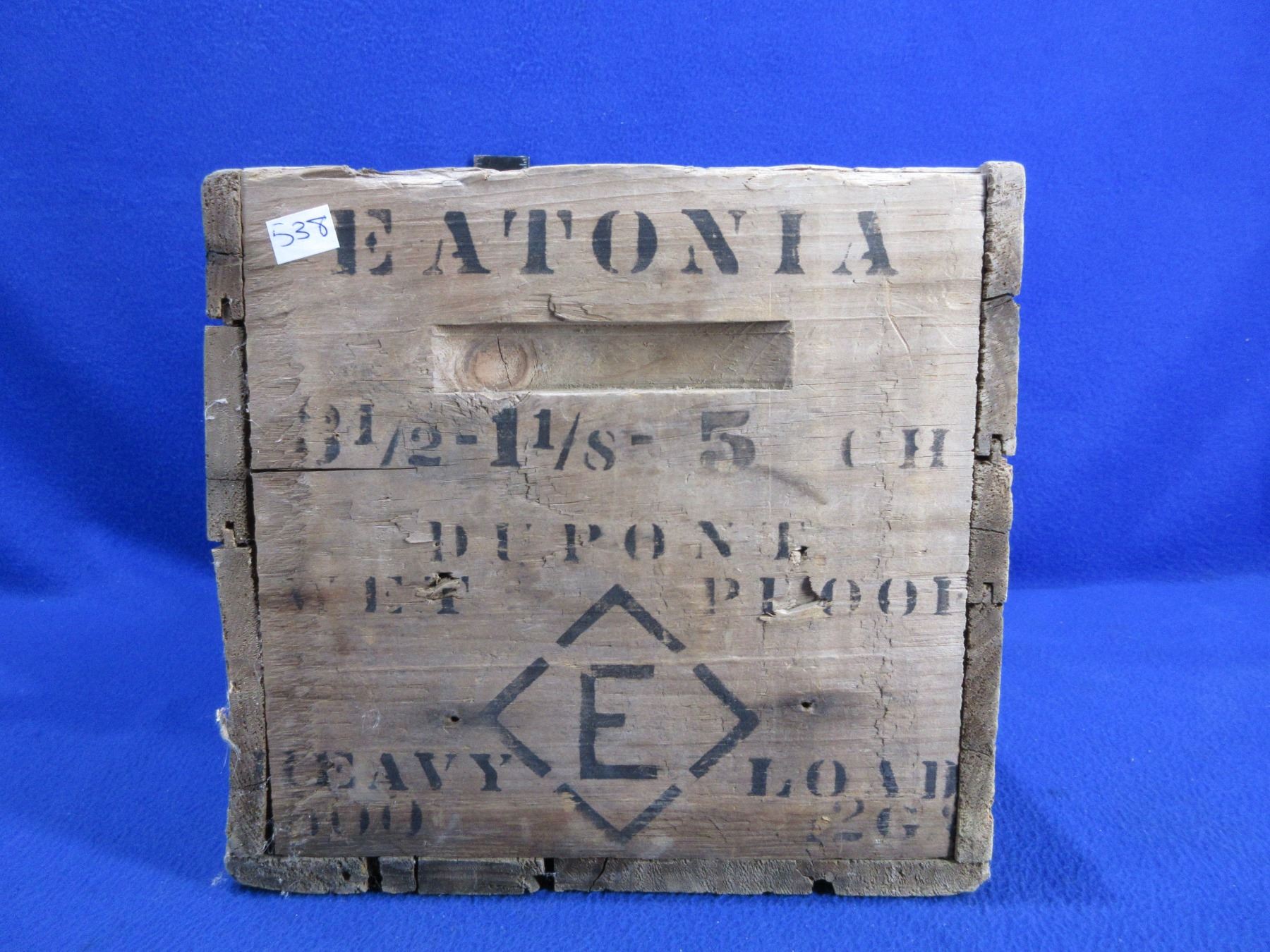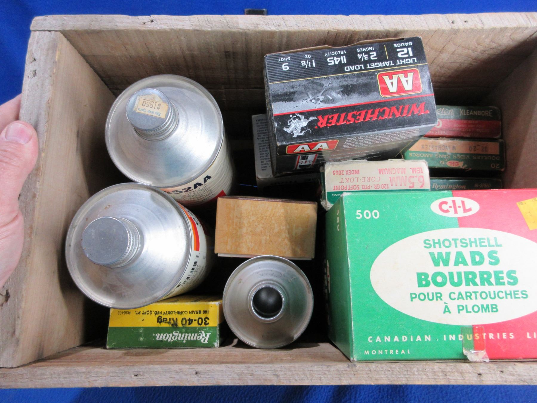 DuPont Wood Ammo Box with Empty Ammo Boxes and Powder Tins - Wood Box is 15" x 9 1/2" x 8 3/4" High