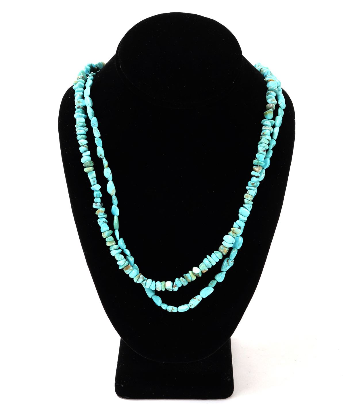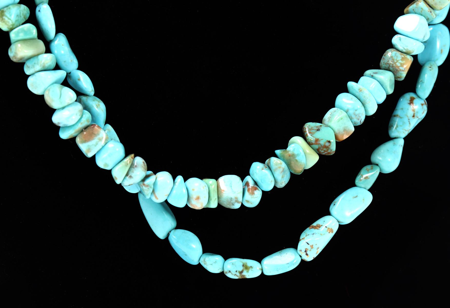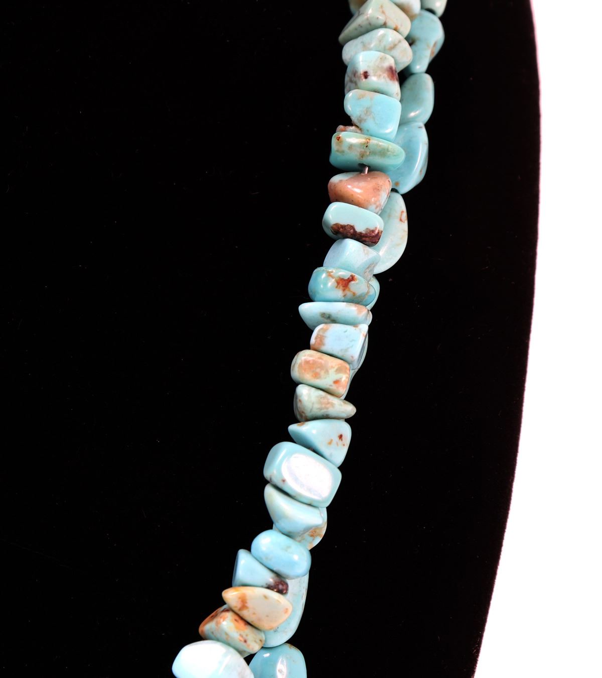 Lovely dual strand raw turquoise beaded necklace with varying sizes of tumble polished turquoise beads. Sterling silver twisted rope style slit clasp. Size 30" L. Condition: Wonderful wearable condition throughout.