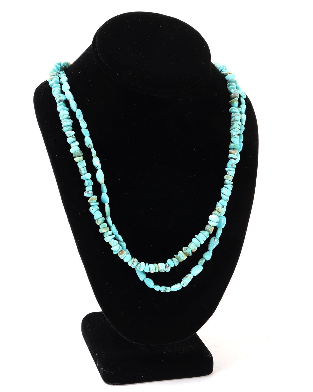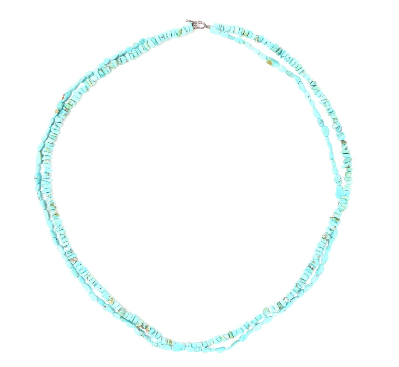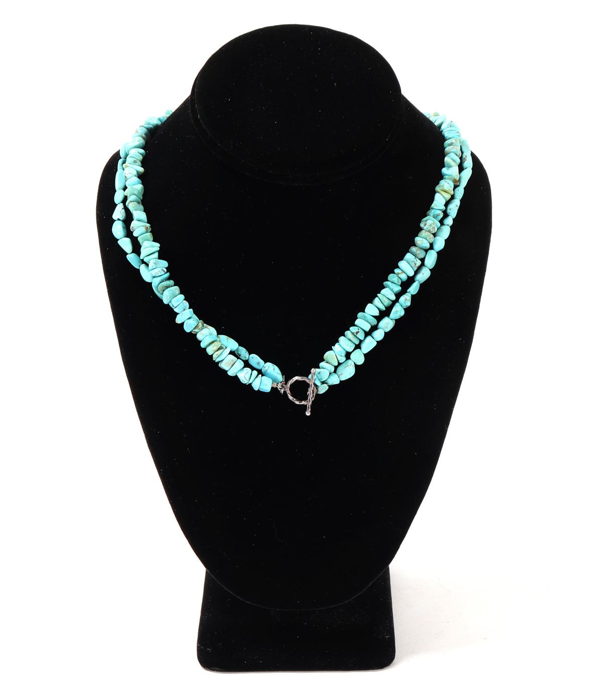 Lovely dual strand raw turquoise beaded necklace with varying sizes of tumble polished turquoise beads. Sterling silver twisted rope style slit clasp. Size 30" L. Condition: Wonderful wearable condition throughout.