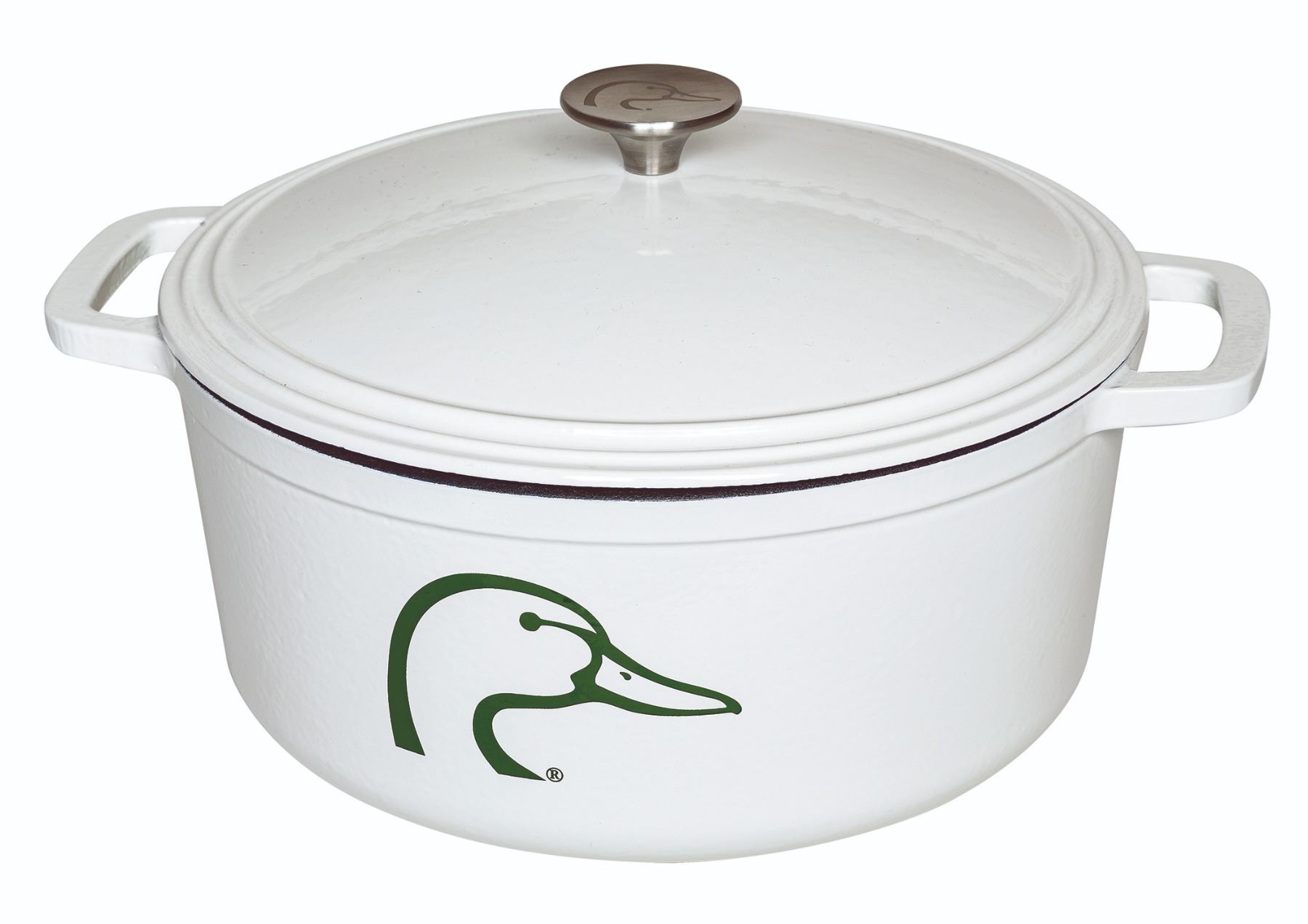 This 6.5-quart dutch oven is perfect for the hunting camp or everyday use at home. The cookware is made of durable enamel coated cast iron and features a green DU logo on the white enamel, two carry handles, and a DU logo etched on the stainless steel knob. Constructed for use on any stovetop or in the oven up to 500 degrees.