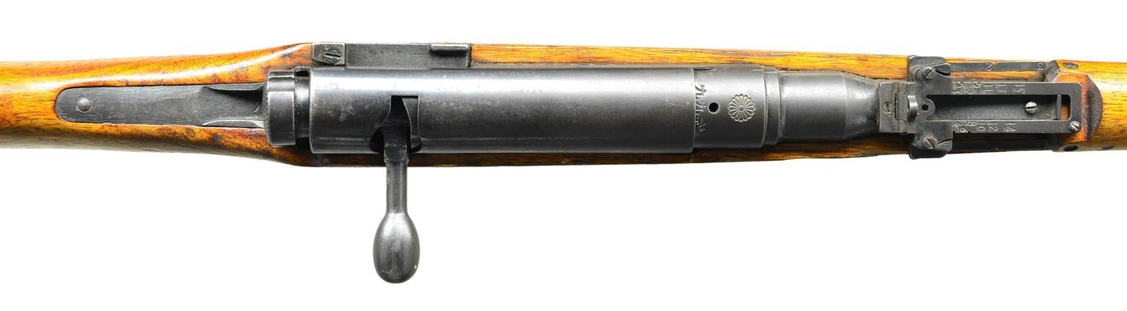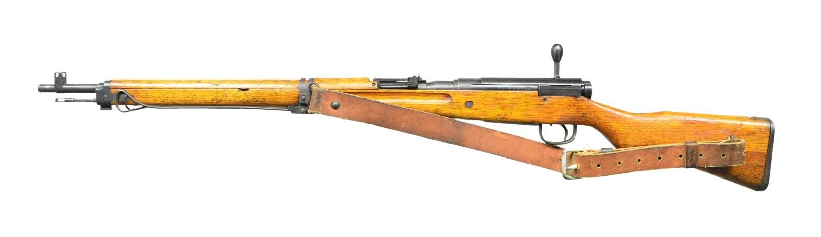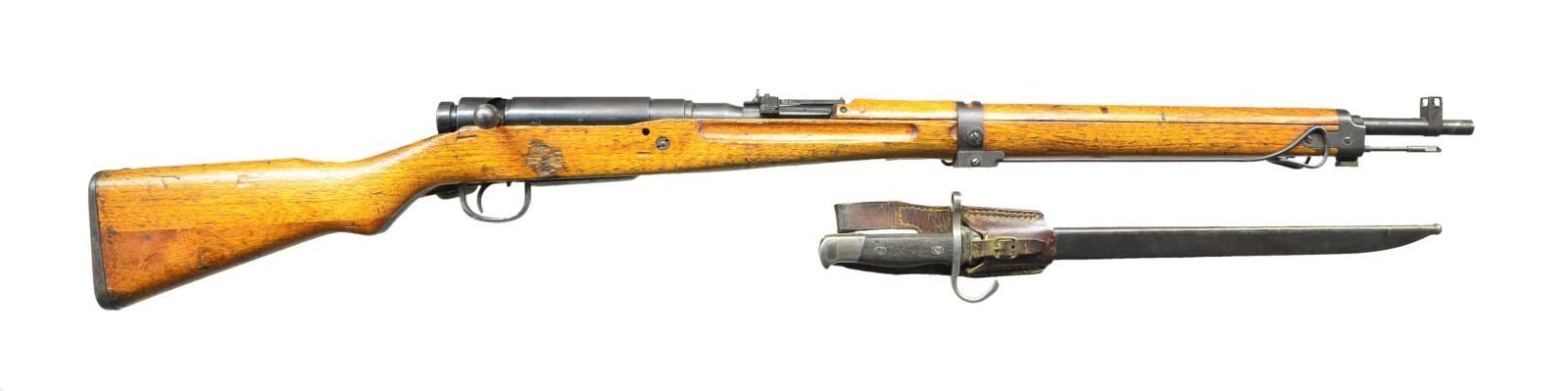 Cal. 7.7 Jap. S# 53899. Bbl. 25 1/2". Safety is mismatched but all other numbers are matching including dust cover. Very fine & complete early Type 99. Top of receiver has fully intact mum & Type 99 markings. Left side of receiver has serial, Nagoya & 1st series marking. Ladder rear sight graduated to 1500m w/ AA wings. Blade front sight w/ protective ears. Original monopod present w/ small proof on foot. Asian hardwood two piece stock w/ thick buttplate & Nagoya marking on underside of butt. Cleaning rod present. Left side sling swivels w/ original sling. Sling has white paint Kanji markings. UNATTACHED ACCESSSORIES: brightly finished Nagoya hooked quillon Type 30 bayonet w/ scabbard & front in good overall condition. CONDITION: stock retains much original Urushi w/ a filler repair on belly ahead of drain hole. Stock otherwise has a notable rough area to right of action, a few gouges, chips, scattered dings & handling marks. Metal retains 50% original blue w/ a couple spots of sticker residue, scattered thinning, oxidation & fading. Very good bore. PROVENANCE: From the Lifelong Collection of Glen E. Mattox. (23-84/MJC). CURIO. $700-900.
