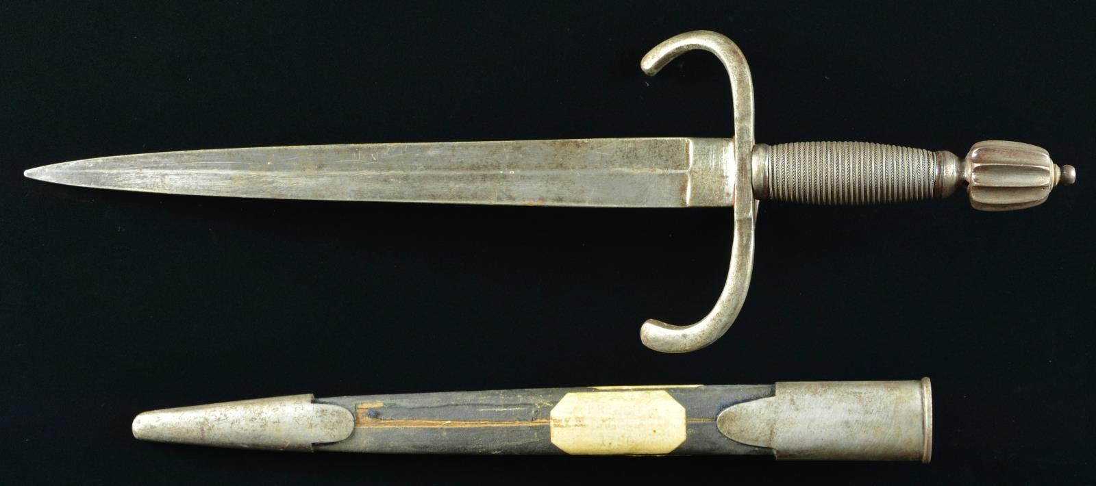 GAUCHE. Overall length: 17”. Blade length: 10 3/4". The parrying dagger was an important ancillary arm utilized in European Renaissance swordplay. It was most often held in the left hand giving rise to its synonym “the left hand dagger”. In reality the dagger would be carried in the offhand, as the dominant hand would wield the rapier. A gentleman’s attire was not complete with solely a rapier, but fashion & safety would command the use of a main gauche. This example has a plain blade with a raised medial ridge. The iron hilt has a downturned guard with a central ring. The dagger is topped with a lobed melon shaped pommel and wire-wrapped grip. Leather covered wood scabbard with iron mounts. The top mount has an elongated frog stud to aid in carrying the weapon. CONDITION: blade has a mottled gray patina. The remainder of the hilt has a dark patina with some areas of oxidation. The scabbard body is a bit shrunk but remains solid. The mounts have an oxidized gray finish. (02-19556/BF). $800-1,200.