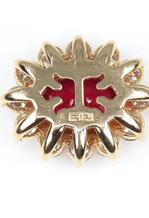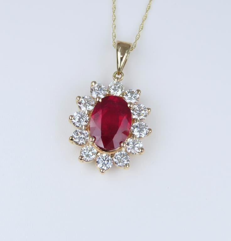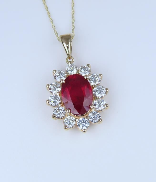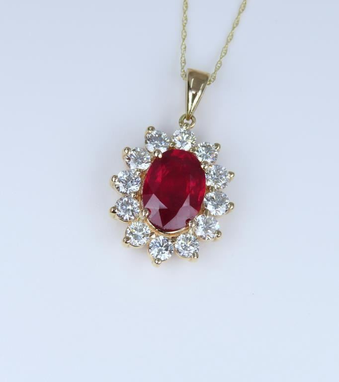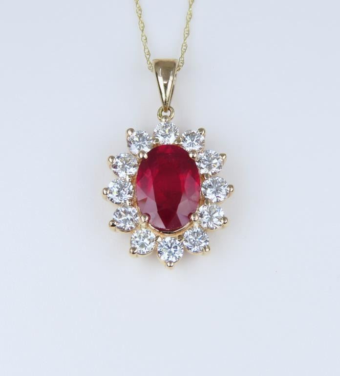 Spectacular ‘EFFY’ Design Ruby and Diamond Pendant featuring a natural treated, oval cut Vivid Red Ruby weighing approx. 3.50 carats and framed by 12 round cut Diamonds weighing approx. 1.80 carats with G-H colors and VS/SI clarity set in a designer Halo style 14 karat yellow gold setting. Retail $8,000-$9,000.