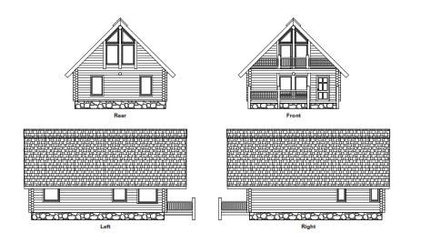 • Cedar log railing for interior loft and exterior balcony and 8’ x 24’ front deck with 9” deck, balcony and loft posts