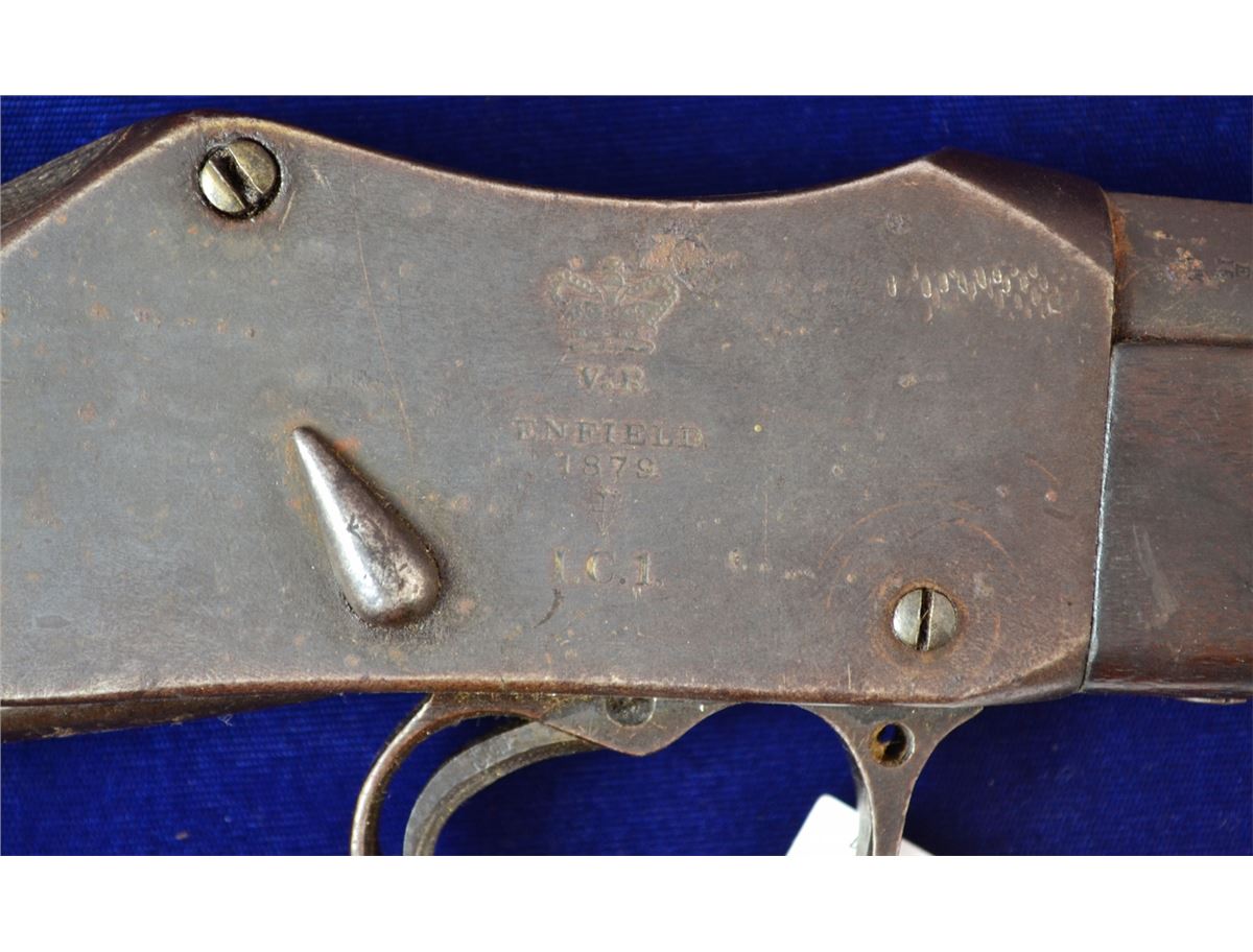 ENFIELD 1879 HAS "JS" INITIALS IN BUTT STOCK IN SMALL HEADED NAILS 21INCH BARREL CAL UNKNOWN PRE 98