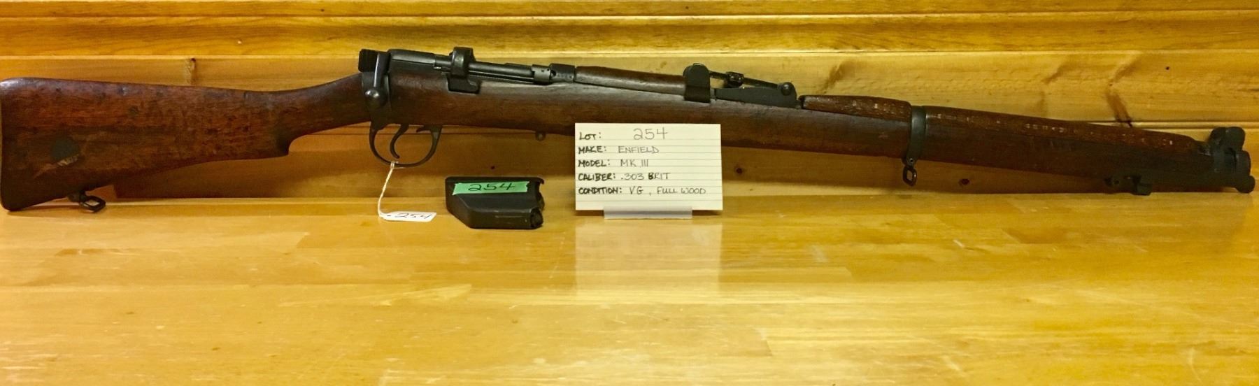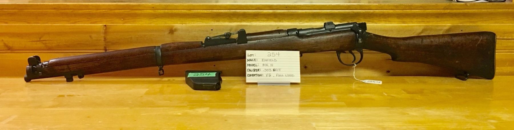 LOT: 254 MAKE: ENFIELD MODEL: MK. 111 CALIBER: .303 BRIT CONDITION: VG, FULL WOOD S/N: 4245