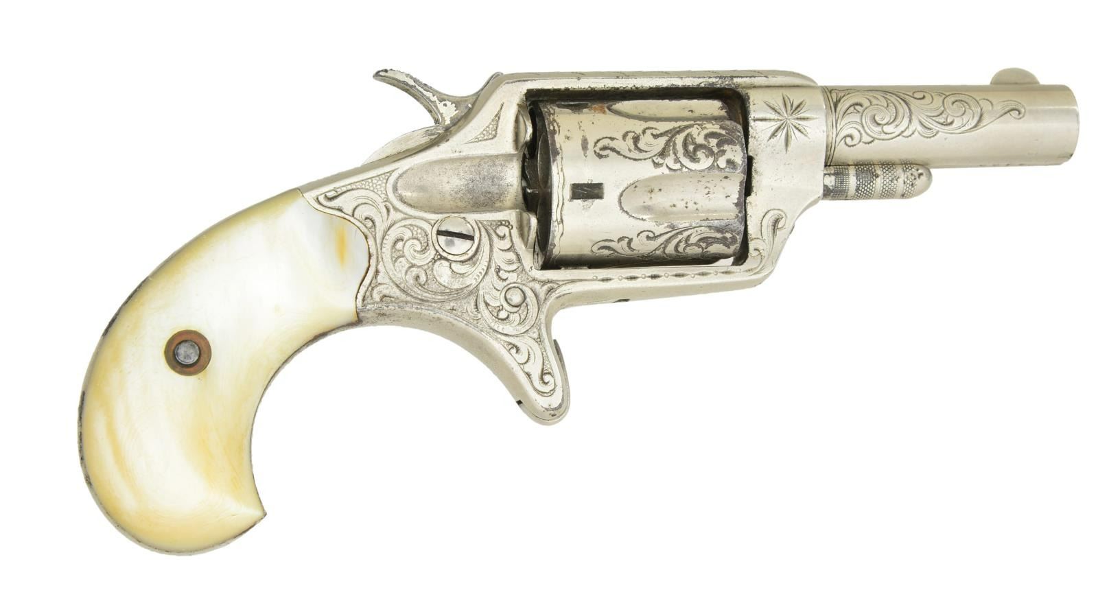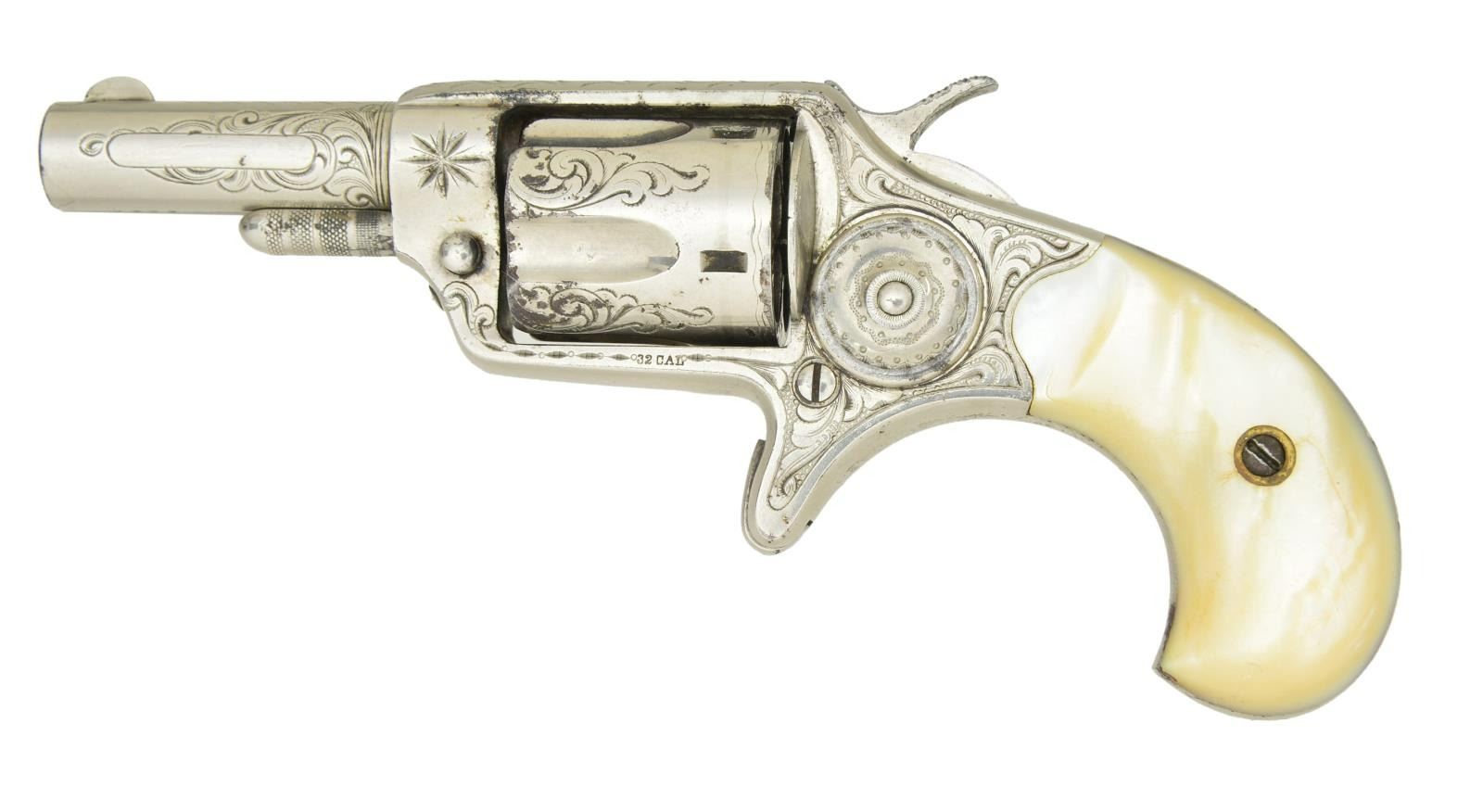 WITH MOTHER OF PEARL GRIPS. Cal. 32 RF. S# 6499 (1874). Bbl. 2 1/4". Full nickel finish w/ scroll engraving having punch dot backgrounds highlighted by sunburst motifs & wheat chaffe. 2 Piece bird's head Mother of Pearl grips. Matching numbered bbl. & 5 shot fluted cyl. CONDITION: Good nickel showing peeling along edges, patina on exposed metal on grip straps & cyl, & light fading of markings; etched panel on bbl. heavily faded. Good pearl grips w/ oxidation on backs. Fair bore w/ distinct rifling & pitting throughout. (01-22936/MD). ANTIQUE. $600-900.