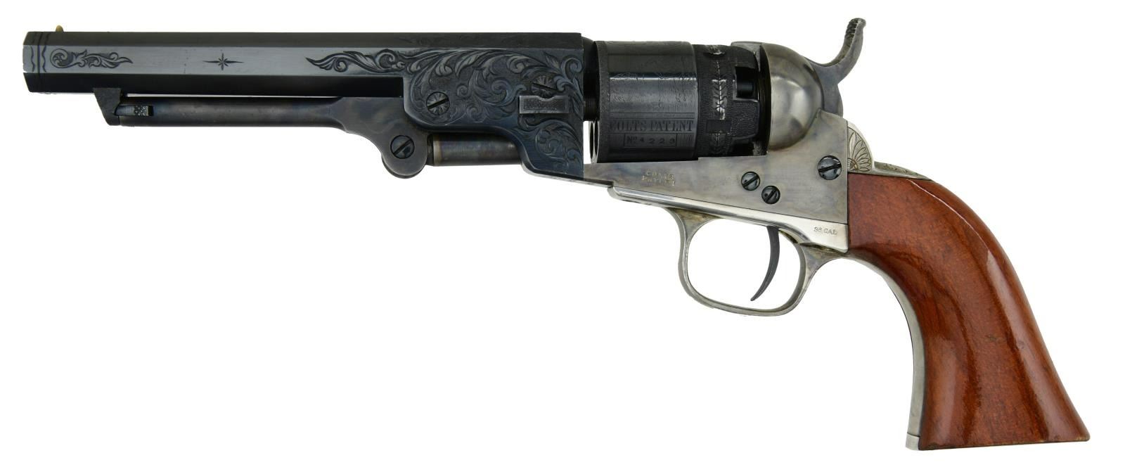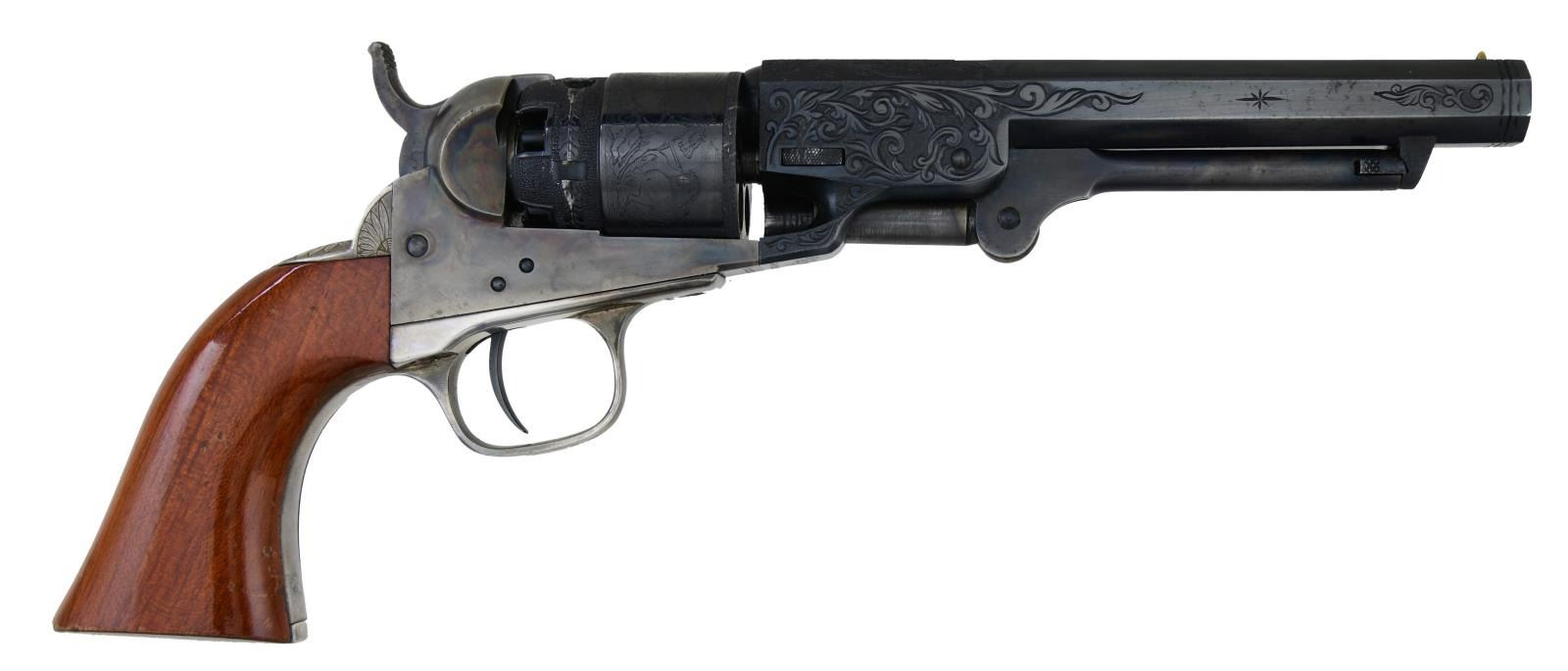 Cal. 36 Percussion. S# 54223. Bbl. 5 1/2". All visible matching numbers. Blued bbl. cyl. & ejector rod. Case colored frame & hammer. Silver plated triggerguard & straps. Several places on this revolver have floral engraving including bbl., backstrap & bottom of trigger guard. Cyl. has wagon & horse scene. Smooth walnut grips. CONDITION: grips show light flaking varnish & some handling marks. Trigger guard & straps show light tarnish & handling wear. Balance of metal retains 95% original blue & case colors w/ some scattered light freckling spots. Good bore that will likely clean up better. (01-22650/MJC). ANTIQUE. $300-500.
