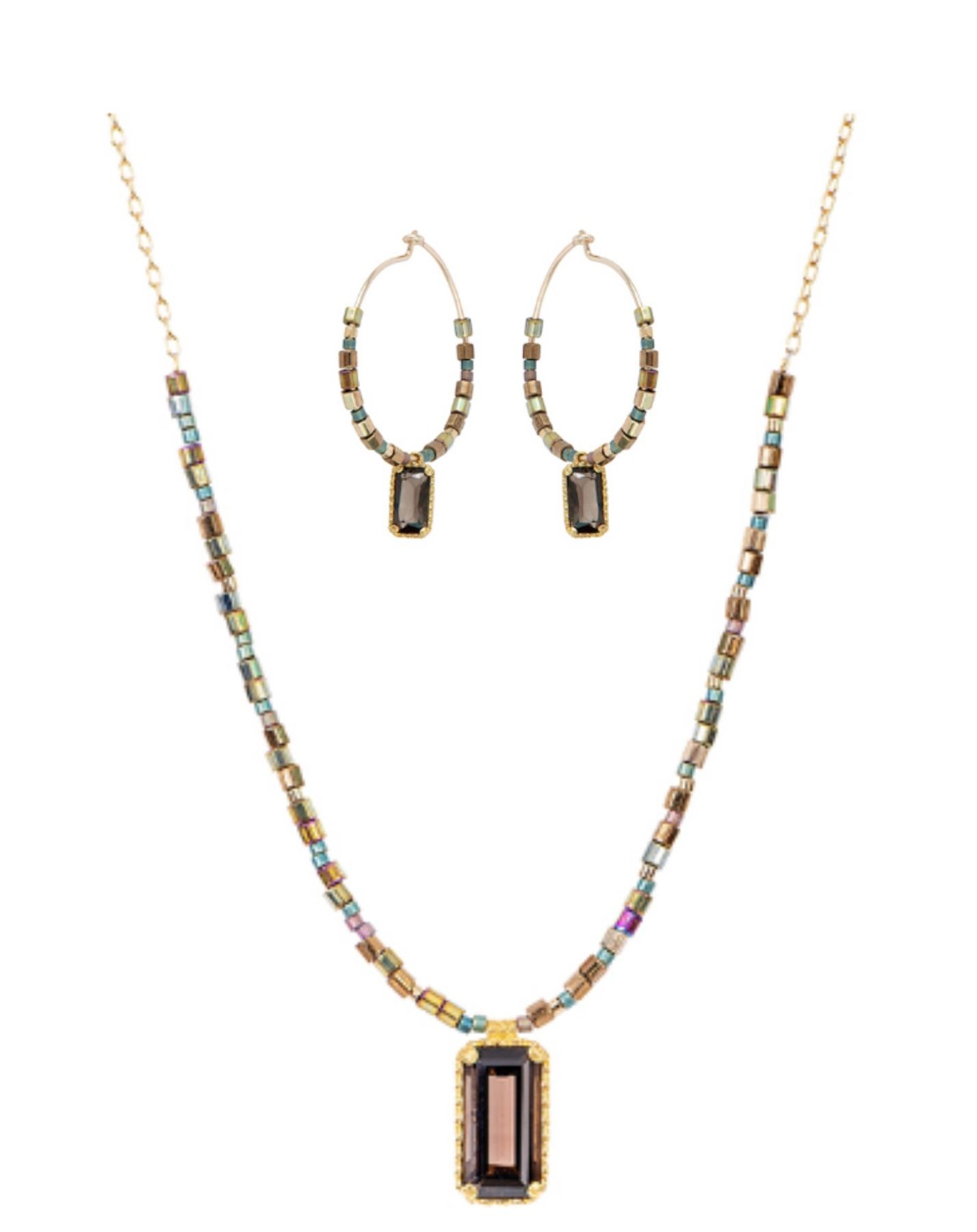 These ESBE LAUREN COLLECTION EARRINGS are also crafted with MIYUKI glass beads, considered a "world standard" for their high quality, brilliance, and uniform shape. They are highly sought after by fashion designers and artists. The Lauren Collection features multiple shapes of Miyuki beads with Smoky Quartz as the focal point. Features: multi color miyuki beads on 14k gold filled wire hoops., faceted smokey quartz set in brass. hangs to 2 inches. The matching LAUREN NECKLACE also utilizes MIYUKI glass beads All pieces in theThe Lauren Collection showcase multiple shapes of Miyuki beads with Smoky Quartz as the focal point. Necklace Features: Multi-color Miyuki beads on 14K Gold over Brass chain, Lobster style closure, Faceted Smoky Quartz set in Brass, 17-20 inch length.