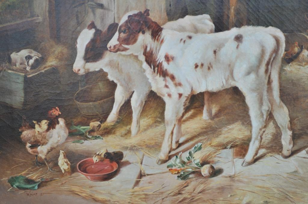 EVE-10 ORIGINAL OIL PAINTINGFine original oil painting of barn scene depicting calves, chicks and sleeping puppy. Signed lower left W. Hunt ’87 (1887). Measures 18” in height by 23 ½” image only. Shows normal aging in period frame. No majordamage and signature looks good (No bounce under black light). Note: Hunt was a British artist and lived in London. Born in 1861 and died in 1941. He exhibited in the Royal Academy and his records at auction areimpressive with the highest record over $100,000. An almost identical scene sold at Bonham’s Jan. 21, 2015 for $15,480. The estate of Eric Vaule. Est.: $4,000-$8,000Fine original oil painting of barn scene depicting calves, chicks and sleeping puppy. Signed lower left W. Hunt ’87 (1887). Measures 18” in height by 23 ½” image only. Shows normal aging in period frame. No majordamage and signature looks good (No bounce under black light). Note: Hunt was a British artist and lived in London. Born in 1861 and died in 1941. He exhibited in the Royal Academy and his records at auction areimpressive with the highest record over $100,000. An almost identical scene sold at Bonham’s Jan. 21, 2015 for $15,480. The estate of Eric Vaule. Est.: $4,000-$8,000