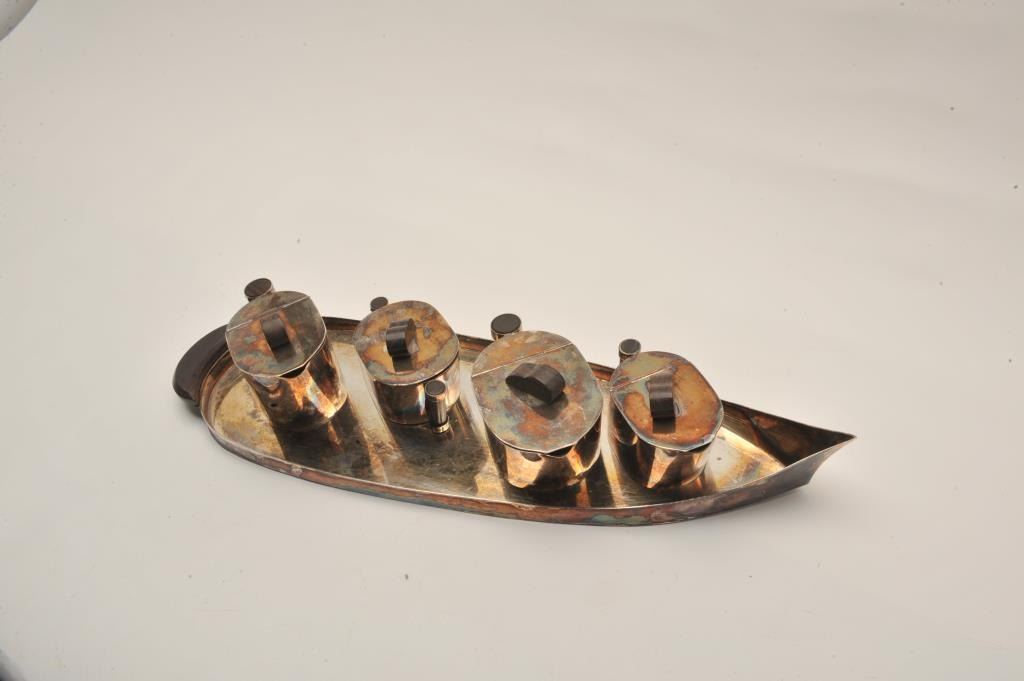 EVE-15 ART DECO COFFEE & TEA SETArt deco coffee and tea set (5 pieces) silver plate with exotic wood handles. Marked France with depose (Pt.) and hallmarks. Possibly for luxury ocean liner. The estate of Eric Vaule. Great design. Est.: $350-$700Art deco coffee and tea set (5 pieces) silver plate with exotic wood handles. Marked France with depose (Pt.) and hallmarks. Possibly for luxury ocean liner. The estate of Eric Vaule. Great design. Est.: $350-$700