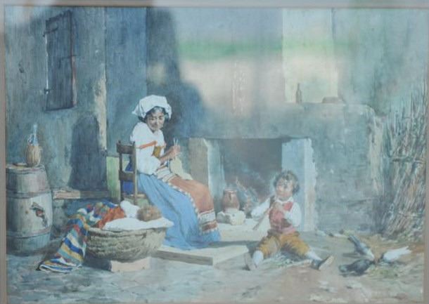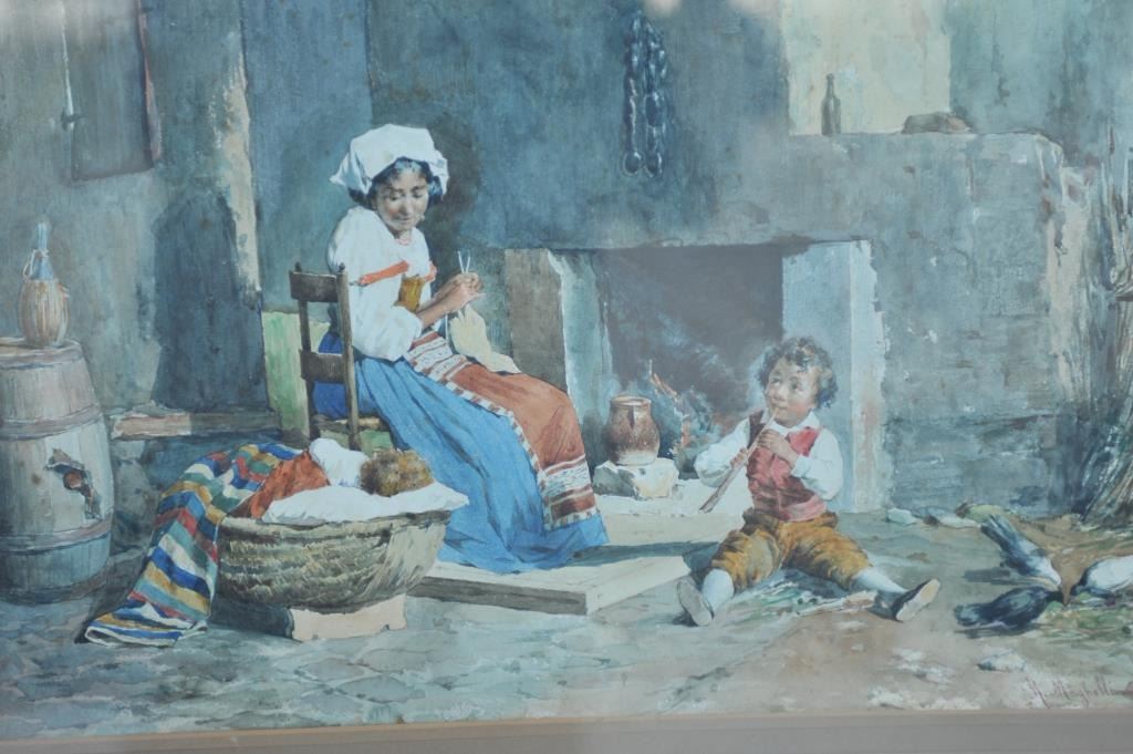 EVE-16 WATERCOLOR SIGNEDExcellent 19th century watercolor signed lower right “R. Maghelli”. Measures 14” x 20”. Shows mother and child playing the flute by the fireplace in rustic 19th century home. Mr. Vaule owned an art gallery inBoston and London in the 1960’s and he kept this piece over 35 years due to quality. The estate of Eric Vaule. Est.: $750-$1500Excellent 19th century watercolor signed lower right “R. Maghelli”. Measures 14” x 20”. Shows mother and child playing the flute by the fireplace in rustic 19th century home. Mr. Vaule owned an art gallery inBoston and London in the 1960’s and he kept this piece over 35 years due to quality. The estate of Eric Vaule. Est.: $750-$1500