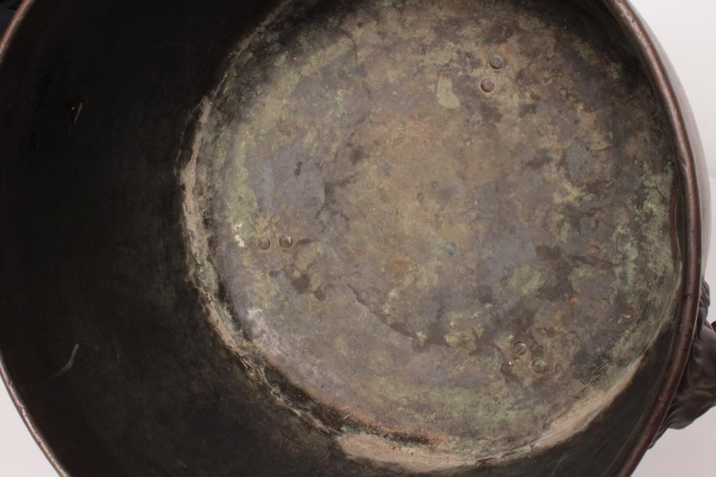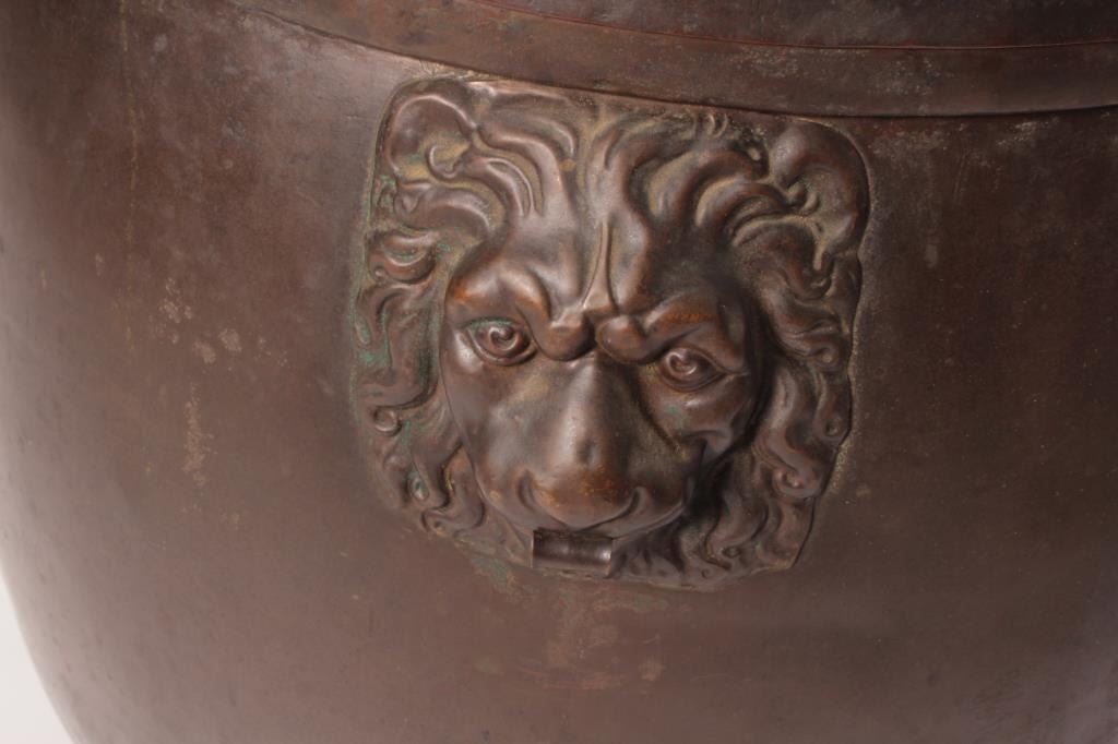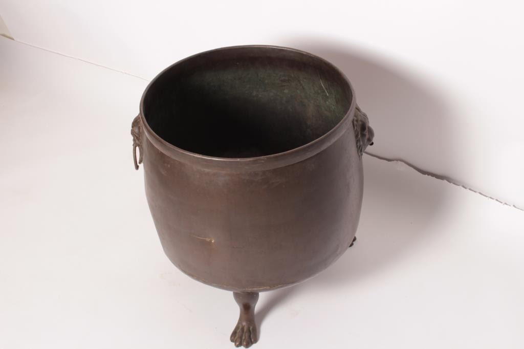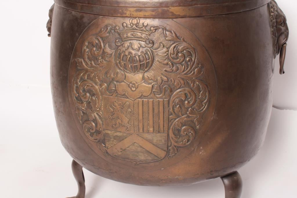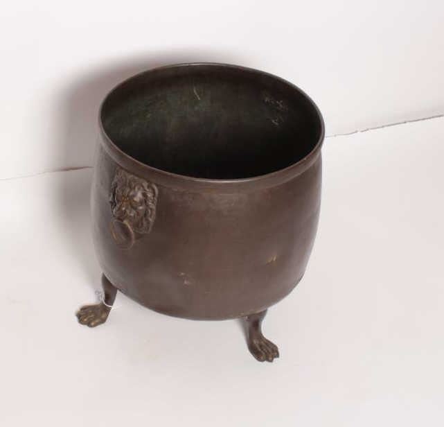 EVE-3 FOOTED BRONZE BRAZIERFooted bronze brazier with armoral crest on the front and lions with rings on the sides. Measures approximately 21” in height by 18 ½” across. One carry ring is missing and the other is broken. Deep patina. Late 18th to19th century. Thought to be Scottish. The estate of Eric Vaule. Est.: $750-$1500Footed bronze brazier with armoral crest on the front and lions with rings on the sides. Measures approximately 21” in height by 18 ½” across. One carry ring is missing and the other is broken. Deep patina. Late 18th to19th century. Thought to be Scottish. The estate of Eric Vaule. Est.: $750-$1500