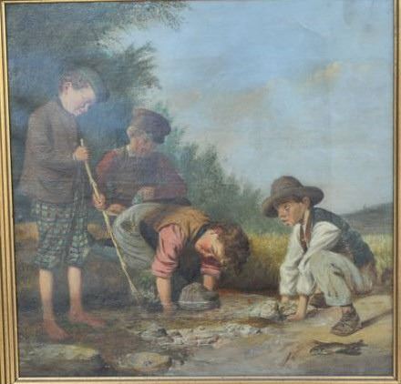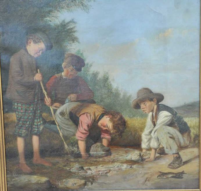 EVE-31 OIL ON CANVASOriginal oil on canvas of Scottish boys fishing. 19th century. Measures approximately 15” x 14”. Nicely framed. Late 19th to 20th century and unsigned. An excellent work. Minor normal aging only. The estate of EricVaule and he would never offer it for sale due to lack of signature and the value of sale was not attractive. The quality is superior of this work. Est.: $750-$1500Original oil on canvas of Scottish boys fishing. 19th century. Measures approximately 15” x 14”. Nicely framed. Late 19th to 20th century and unsigned. An excellent work. Minor normal aging only. The estate of EricVaule and he would never offer it for sale due to lack of signature and the value of sale was not attractive. The quality is superior of this work. Est.: $750-$1500
