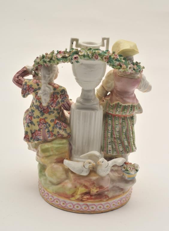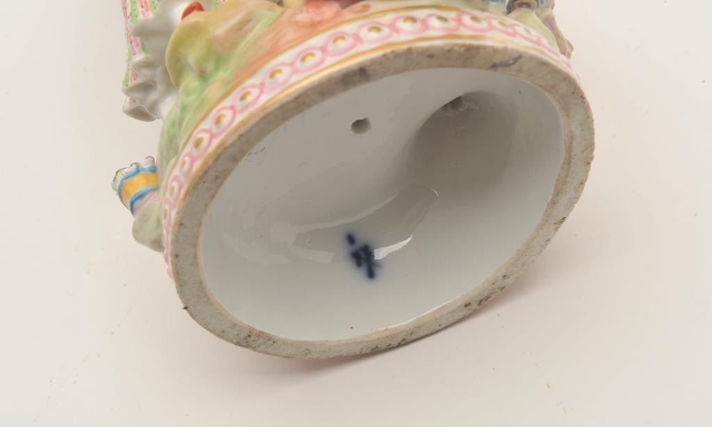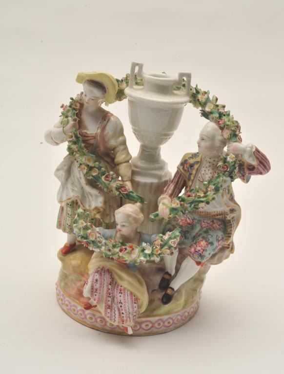 EVE-37 CROSSED SWORDSCrossed swords marked porcelain of 3 figures and urn. Not quite perfect. Minimal chips to flowers. Measures 7 ½”. 19th century. Est.: $200-$400Crossed swords marked porcelain of 3 figures and urn. Not quite perfect. Minimal chips to flowers. Measures 7 ½”. 19th century. Est.: $200-$400