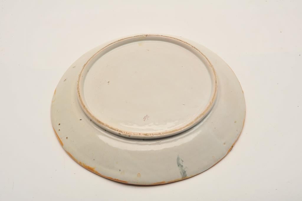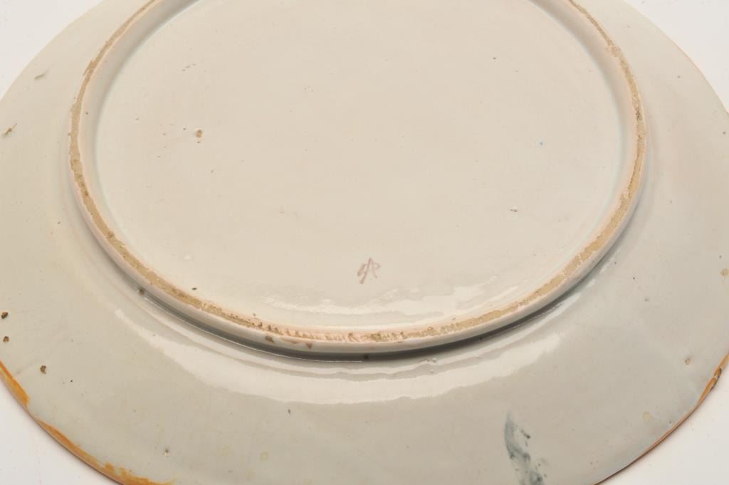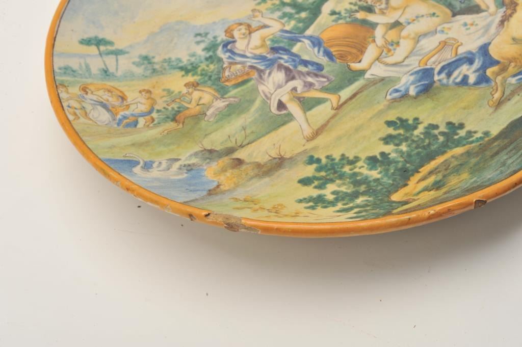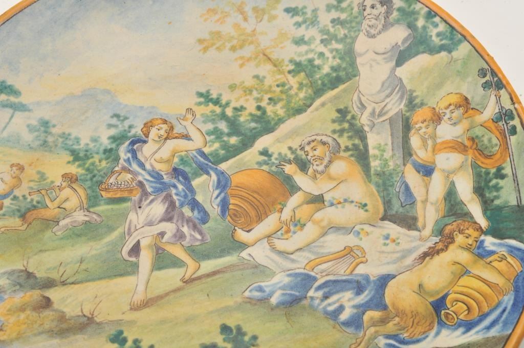 EVE-38 ITALIAN CHARGER18th to 19th century Italian charger with amusingly suggestive scenes marked “D.A.”. Measures 14” across. Several large chips to the rim. Still vibrant colors and restorable easily. The estate of Eric Vaule. Est.:$350-$70018th to 19th century Italian charger with amusingly suggestive scenes marked “D.A.”. Measures 14” across. Several large chips to the rim. Still vibrant colors and restorable easily. The estate of Eric Vaule. Est.:$350-$700