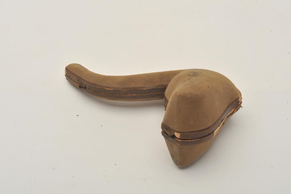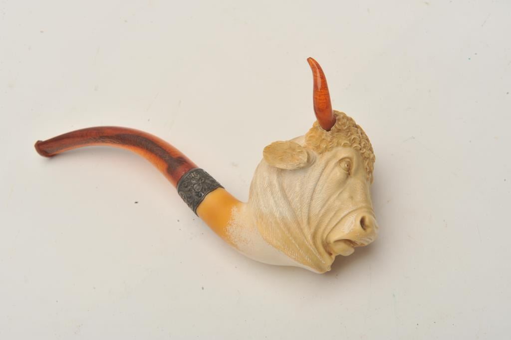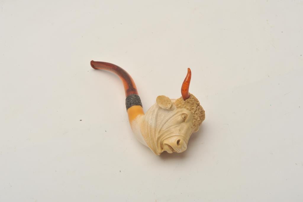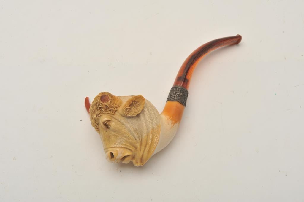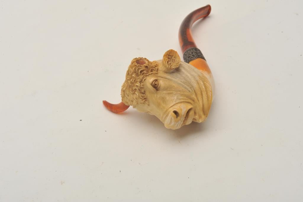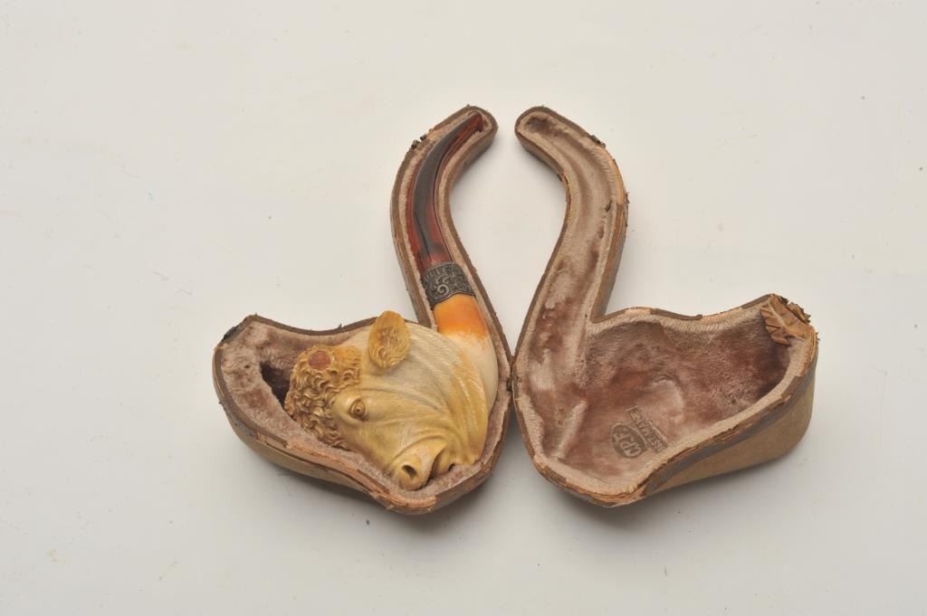 EVE-403 BULL'S HEAD MEERSHAM PIPEFinely carved bulls head meersham pipe in case with amber stem and horns. Case is marked “C.B.F.” Best made. Measures 8” overall. 4” x 3 ¼” high bowl. Great carving with fine detail and expression. Good to very good except 1 horn is missing and case is unhinged. Restorable. The estate of Eric Vaule. Est.: $200-$400Finely carved bulls head meersham pipe in case with amber stem and horns. Case is marked “C.B.F.” Best made. Measures 8” overall. 4” x 3 ¼” high bowl. Great carving with fine detail and expression. Good to very good except 1 horn is missing and case is unhinged. Restorable. The estate of Eric Vaule. Est.: $200-$400