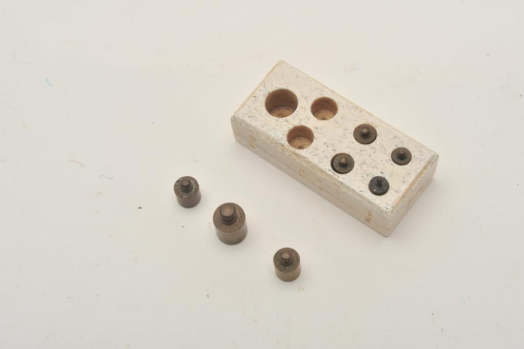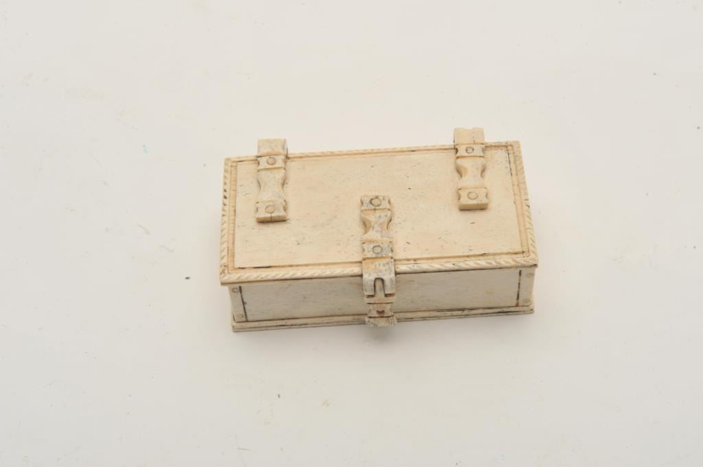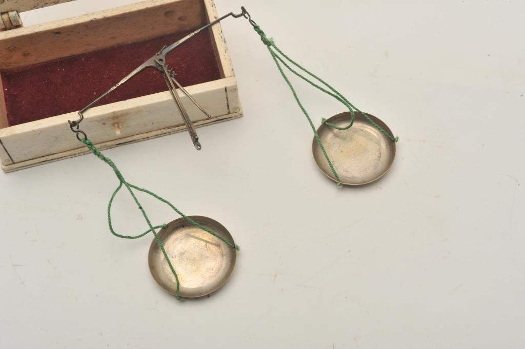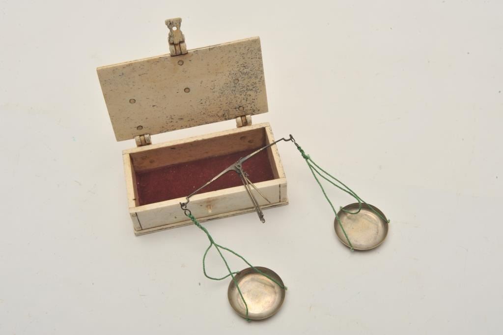 EVE-404 GOLD RUSH ERA SCALEEarly gold rush era scale with terrific sailor made whale bone box and weight block circa 1849-1870. This exact scale was purchased by Little John’s a number of years ago from a Orange County collector of goldscales and sold to Eric Vaule. This scale was the centerpiece of a group displayed in the 60’s-70 by owner of the Howard Hotel in downtown Santa Ana, CA. The Howard Hotel owner collected pocket watches marked Howardand gold mining memorabilia particularly gold scales. John L. Gangel (Pops) was the owners close friend and the family knew him through the assay office 418 S. Main St. Santa Ana which we rented to a coin shop. Measures 5”wide by 2 ½” by nearly 2” in height. Incredible hinges. Weight block measures 3 ¼” by 1 3/8” by 1” in height. Brass weights in English grams. The scale is early “string” type rather than chains. The best in acollection that numbered over 40 and most purchased from pioneer California families in early days. The estate of Eric Vaule. Est.: $600-$1200Early gold rush era scale with terrific sailor made whale bone box and weight block circa 1849-1870. This exact scale was purchased by Little John’s a number of years ago from a Orange County collector of goldscales and sold to Eric Vaule. This scale was the centerpiece of a group displayed in the 60’s-70 by owner of the Howard Hotel in downtown Santa Ana, CA. The Howard Hotel owner collected pocket watches marked Howardand gold mining memorabilia particularly gold scales. John L. Gangel (Pops) was the owners close friend and the family knew him through the assay office 418 S. Main St. Santa Ana which we rented to a coin shop. Measures 5”wide by 2 ½” by nearly 2” in height. Incredible hinges. Weight block measures 3 ¼” by 1 3/8” by 1” in height. Brass weights in English grams. The scale is early “string” type rather than chains. The best in acollection that numbered over 40 and most purchased from pioneer California families in early days. The estate of Eric Vaule. Est.: $600-$1200