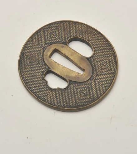 EVE-420 BASKET WEAVE DESIGN TSUBABasket weave design cast brass tsuba for wakasashi (Japan). Hand chasing. 19th century or earlier. The estate of Eric Vaule. Est.: $100-$200Basket weave design cast brass tsuba for wakasashi (Japan). Hand chasing. 19th century or earlier. The estate of Eric Vaule. Est.: $100-$200