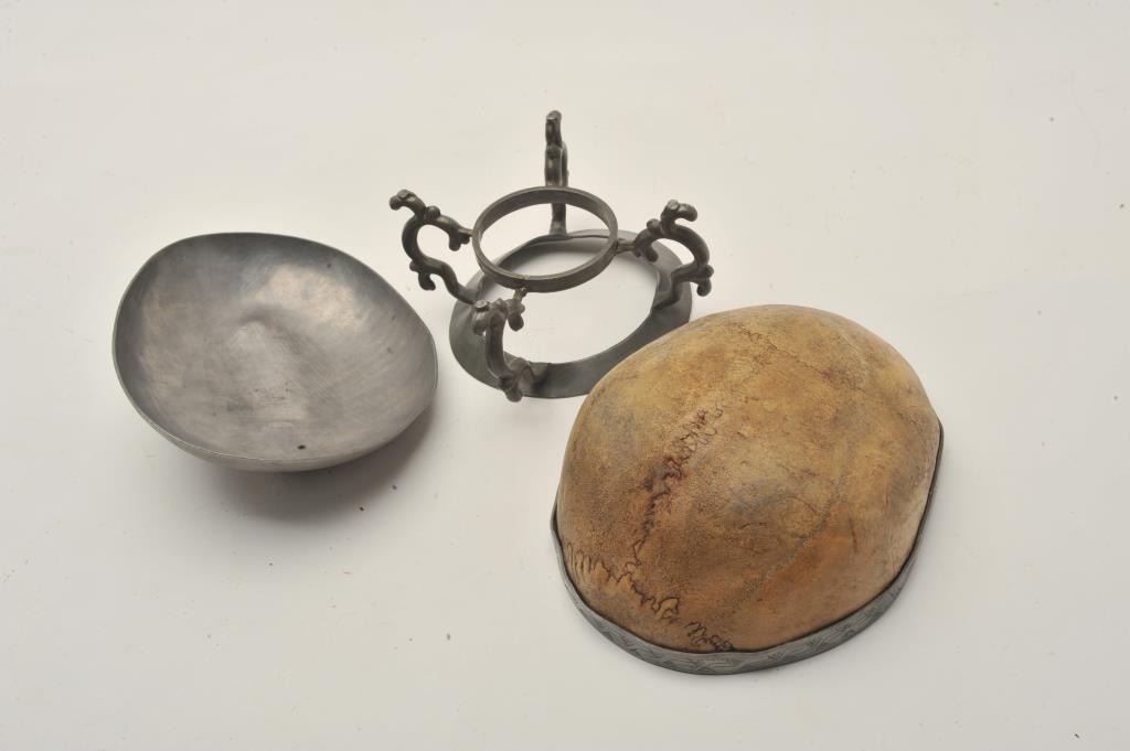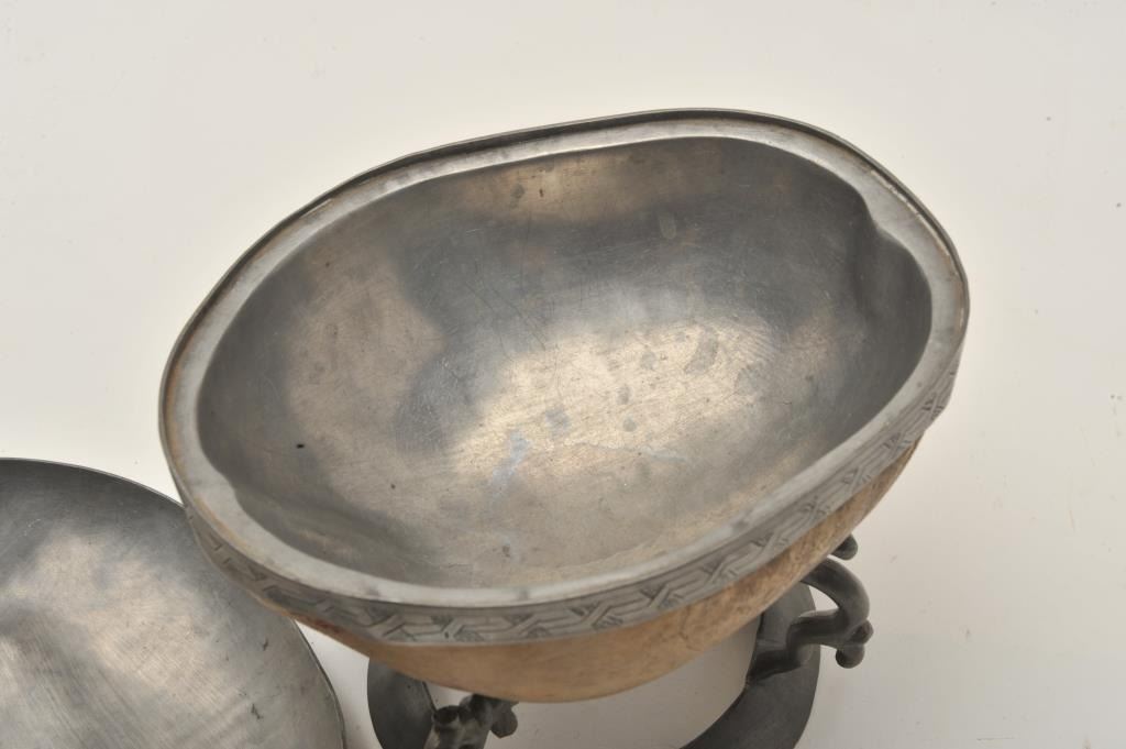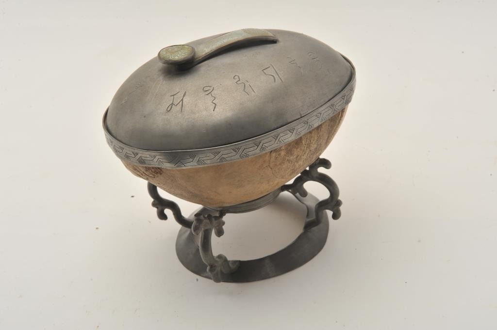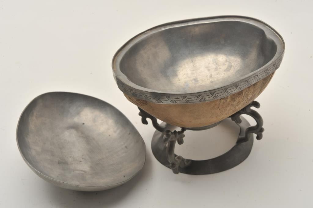 EVE-424 CEREMONIAL BOWLChina or Tibet ceremonial bowl with pewter mounts and carved jade handle. Lot of writing with pewter stand. Est.: $600-$1200China or Tibet ceremonial bowl with pewter mounts and carved jade handle. Lot of writing with pewter stand. Est.: $600-$1200