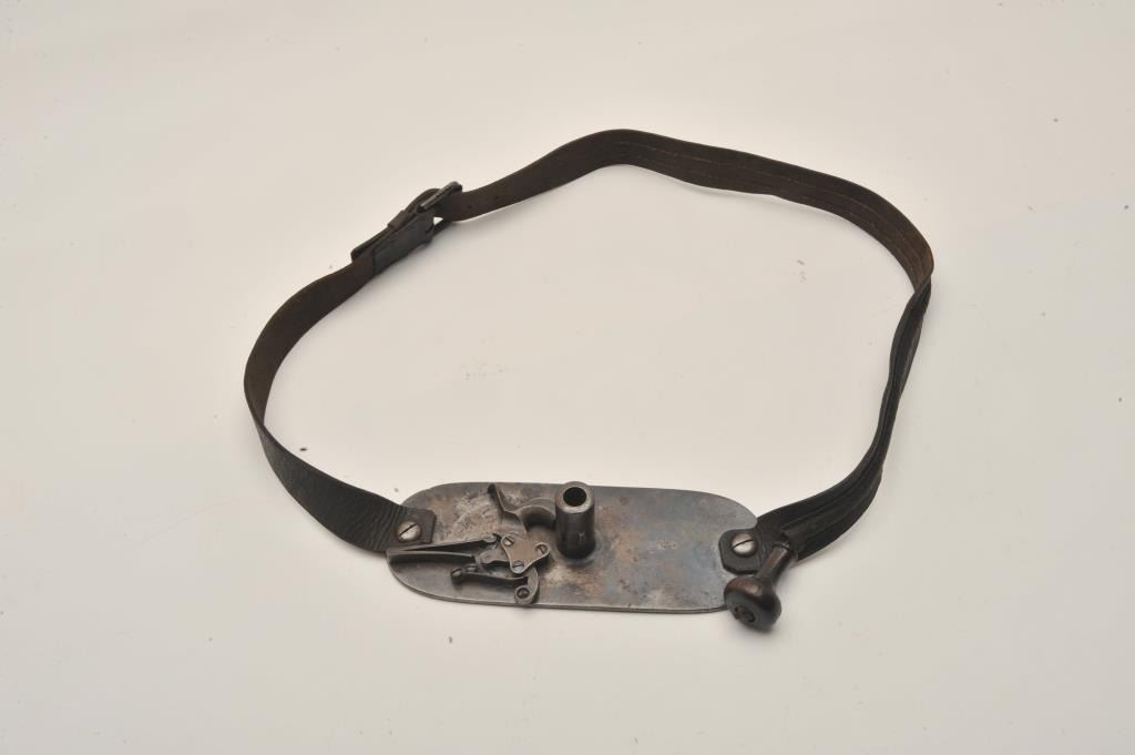 EVE-81 ANTI GARROTING DEVICEAuthentic and only known original anti-garroting device circa Mid-19th century marked “R. Dall’s Patent”. The device was worn as a belt with the gun portion in the center of owner’s back and was fired bylanyard on wire through the belt. In the Mid-19th century thugs were garroting gentleman to lift their wallets and goods. This became a problem and guns, knives and cane swords were used as defense. The gunportion is approximately .40 caliber percussion cap fired on a 7” blued steel plate. The condition is very good plus. A Japaned tin case with flask, mold, wrench and caps are included with suede lined oldoutside carry case. Purchased by Eric Vaule from Norm Flayderman estate at Amoskeag Auction Co. Beware of copies. This is THE original. The estate of Eric Vaule. Est.: $5,000-$10,000Authentic and only known original anti-garroting device circa Mid-19th century marked “R. Dall’s Patent”. The device was worn as a belt with the gun portion in the center of owner’s back and was fired bylanyard on wire through the belt. In the Mid-19th century thugs were garroting gentleman to lift their wallets and goods. This became a problem and guns, knives and cane swords were used as defense. The gunportion is approximately .40 caliber percussion cap fired on a 7” blued steel plate. The condition is very good plus. A Japaned tin case with flask, mold, wrench and caps are included with suede lined oldoutside carry case. Purchased by Eric Vaule from Norm Flayderman estate at Amoskeag Auction Co. Beware of copies. This is THE original. The estate of Eric Vaule. Est.: $5,000-$10,000