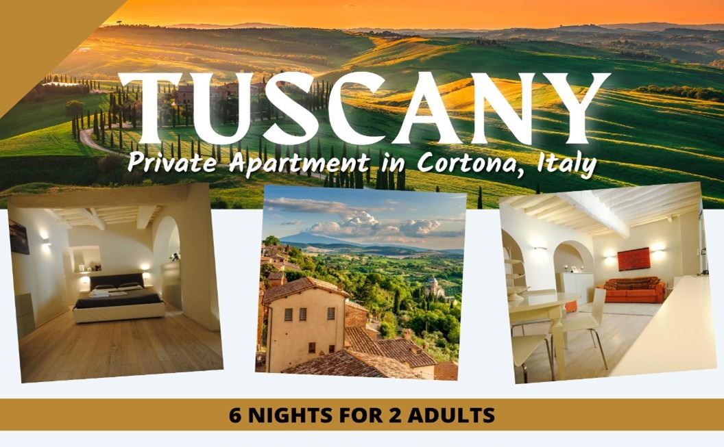 This travel package provides 2 adults with a 6-night stay in a private apartment located in Cortona, Italy, and includes a cooking demonstration with tastings and wine education with 4 local wine tastings. Accommodations and excursions are subject to change and availability without notice, at which time they will be substituted with an equivalent option. Reservations must be booked at least 90 days in advance. Package expires 24 months after date of purchase. Resort fees, local tourism taxes, and other local fees & environmental taxes are not included.