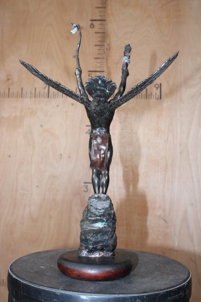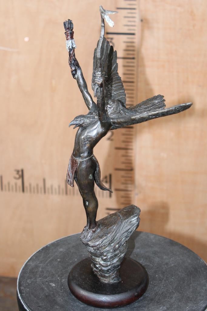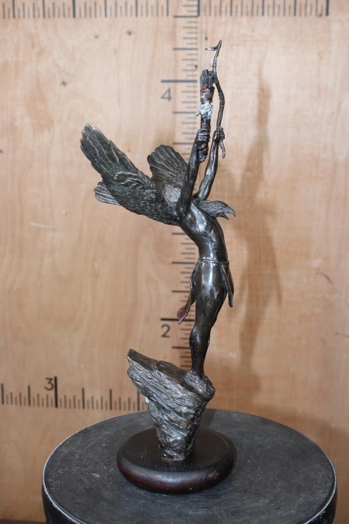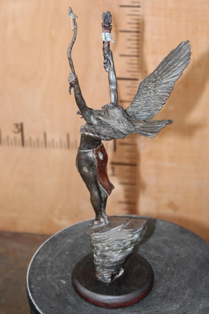 "Eagle of the Sioux" Lawrence Heyda BRONZE Sculpture on a Wood Base. It measures 18" Tall x 10.5" Wide x 6" Depth. The Total Weight is 5 lbs 2 oz. COLLECTIBLE BRONZE ART STATUES