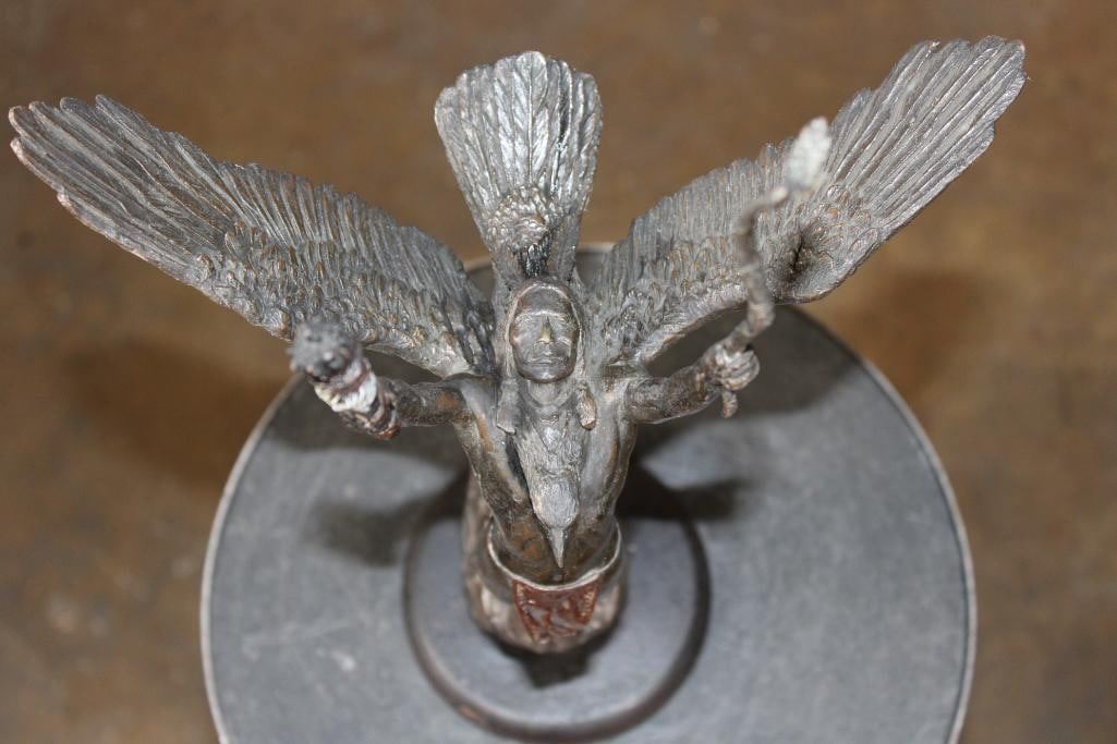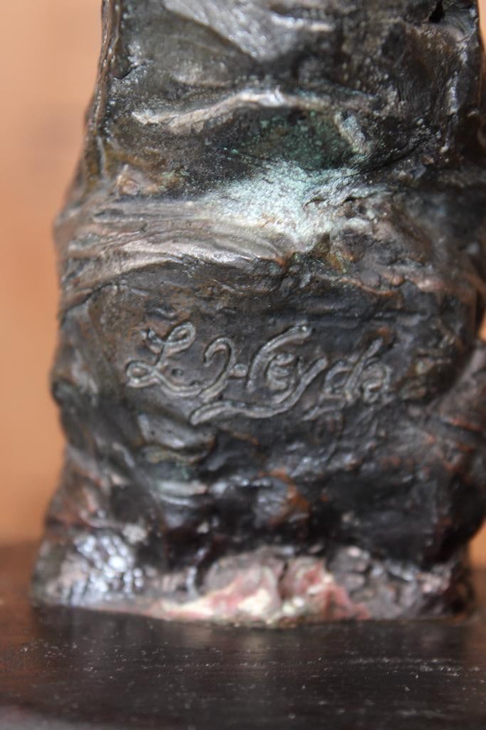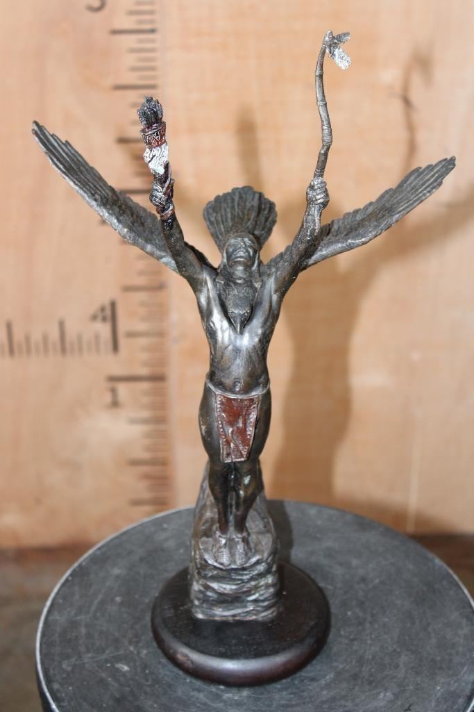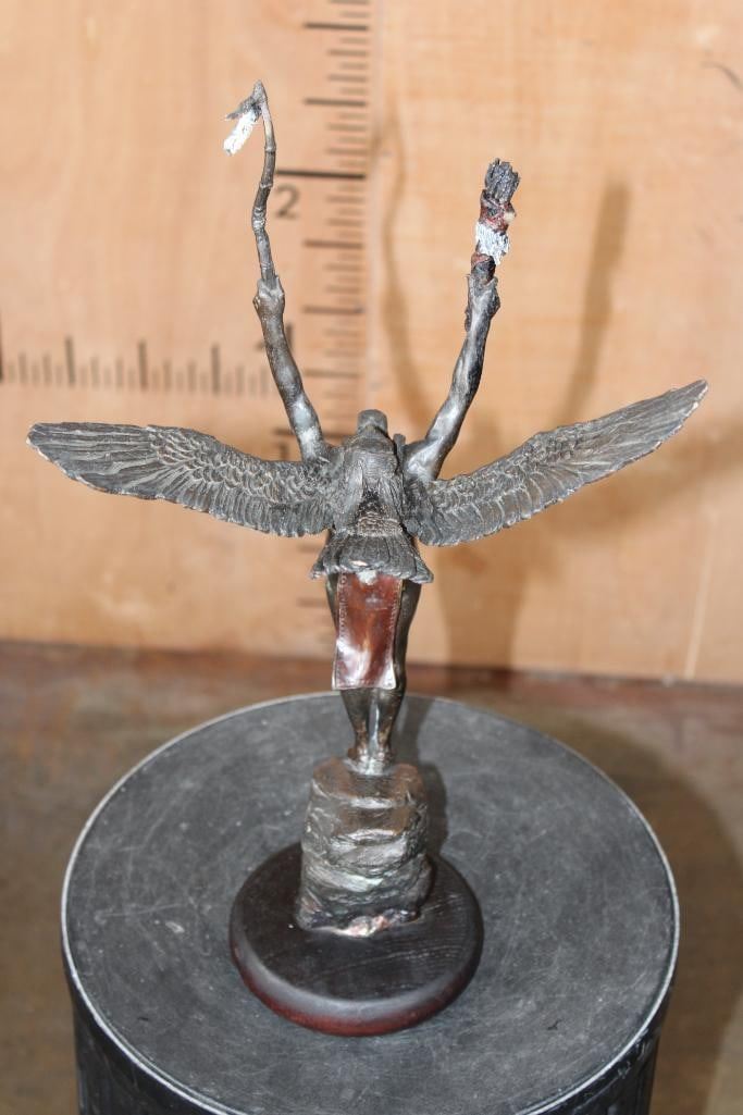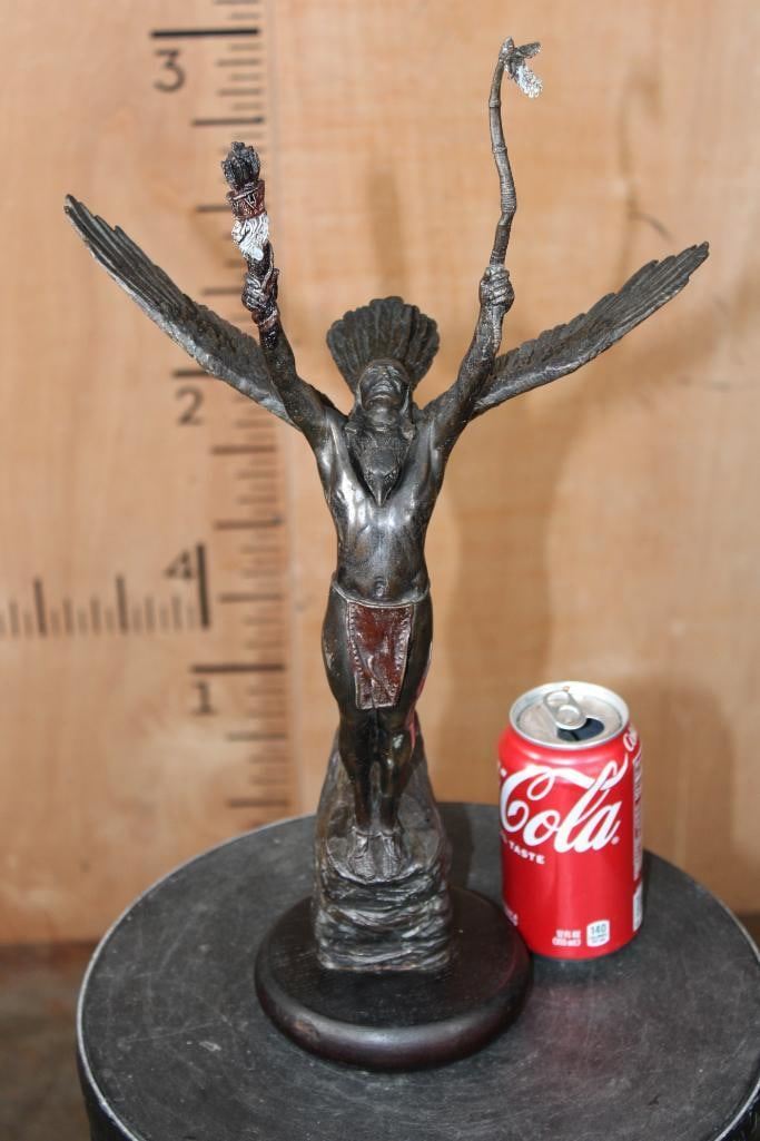 "Eagle of the Sioux" Lawrence Heyda BRONZE Sculpture on a Wood Base. It measures 18" Tall x 10.5" Wide x 6" Depth. The Total Weight is 5 lbs 2 oz. COLLECTIBLE BRONZE ART STATUES