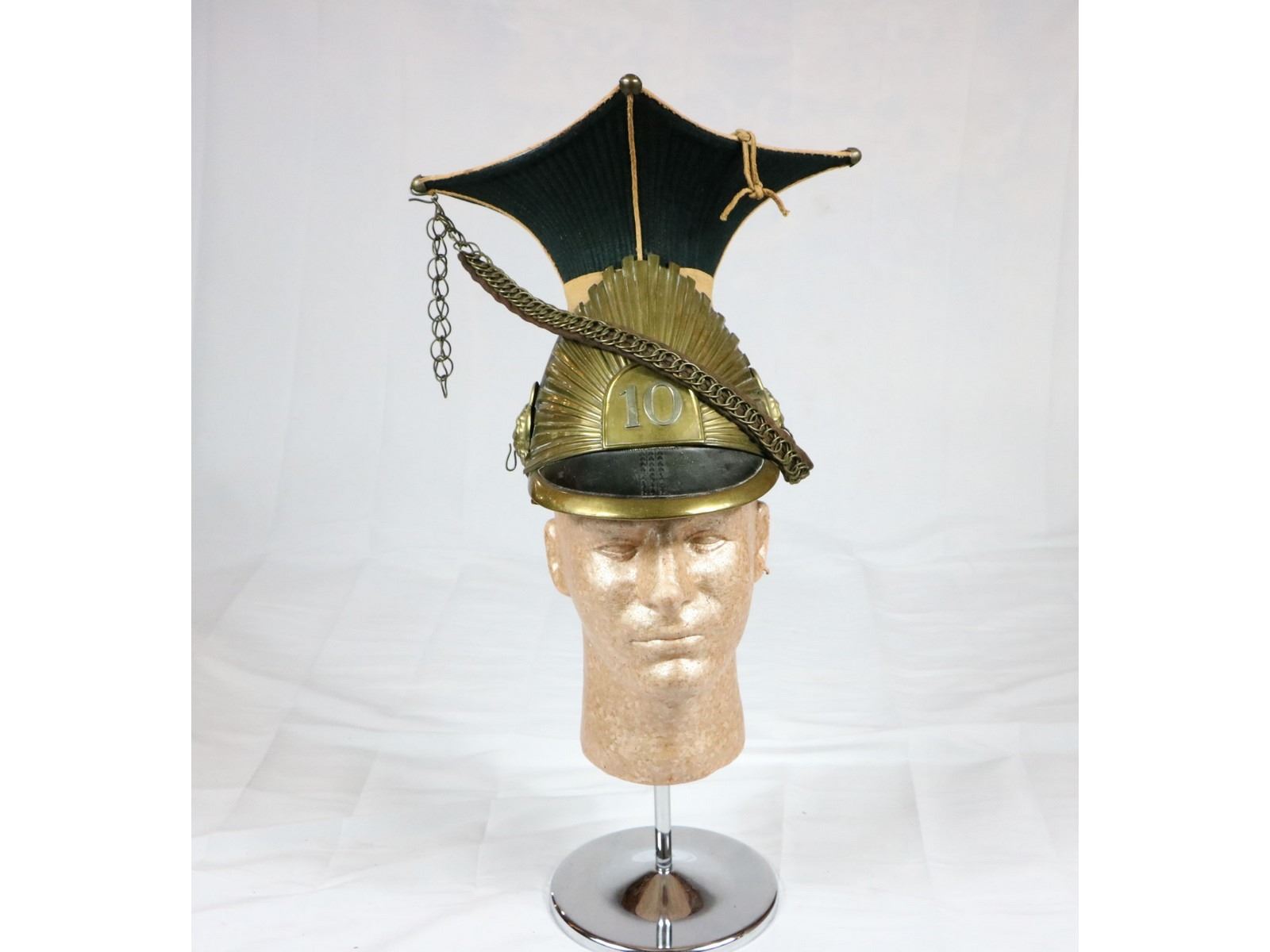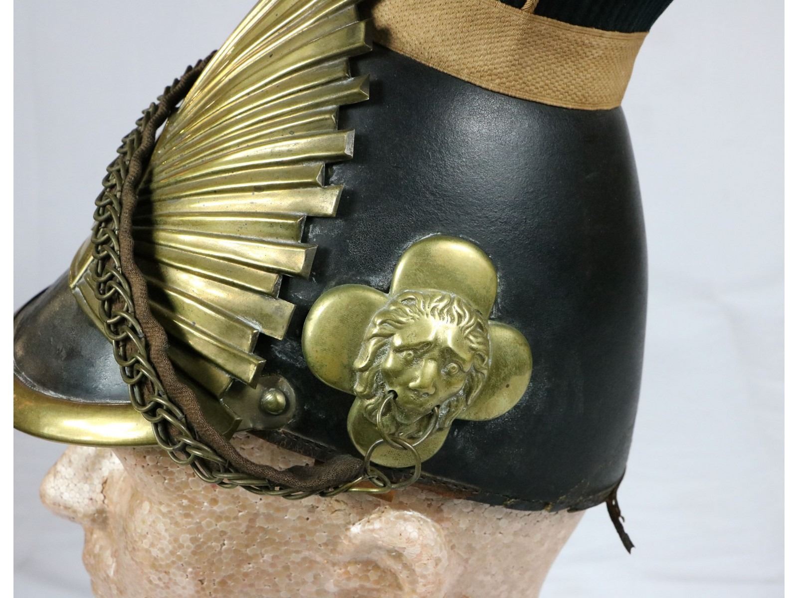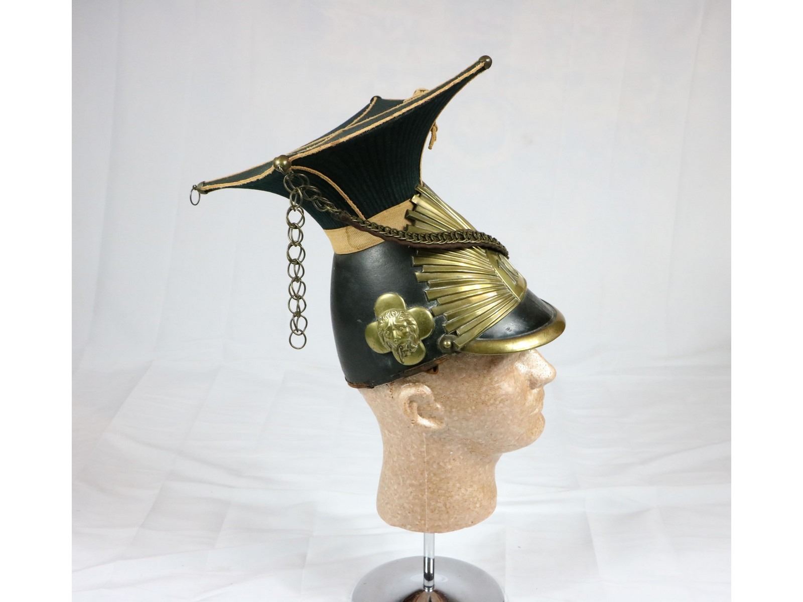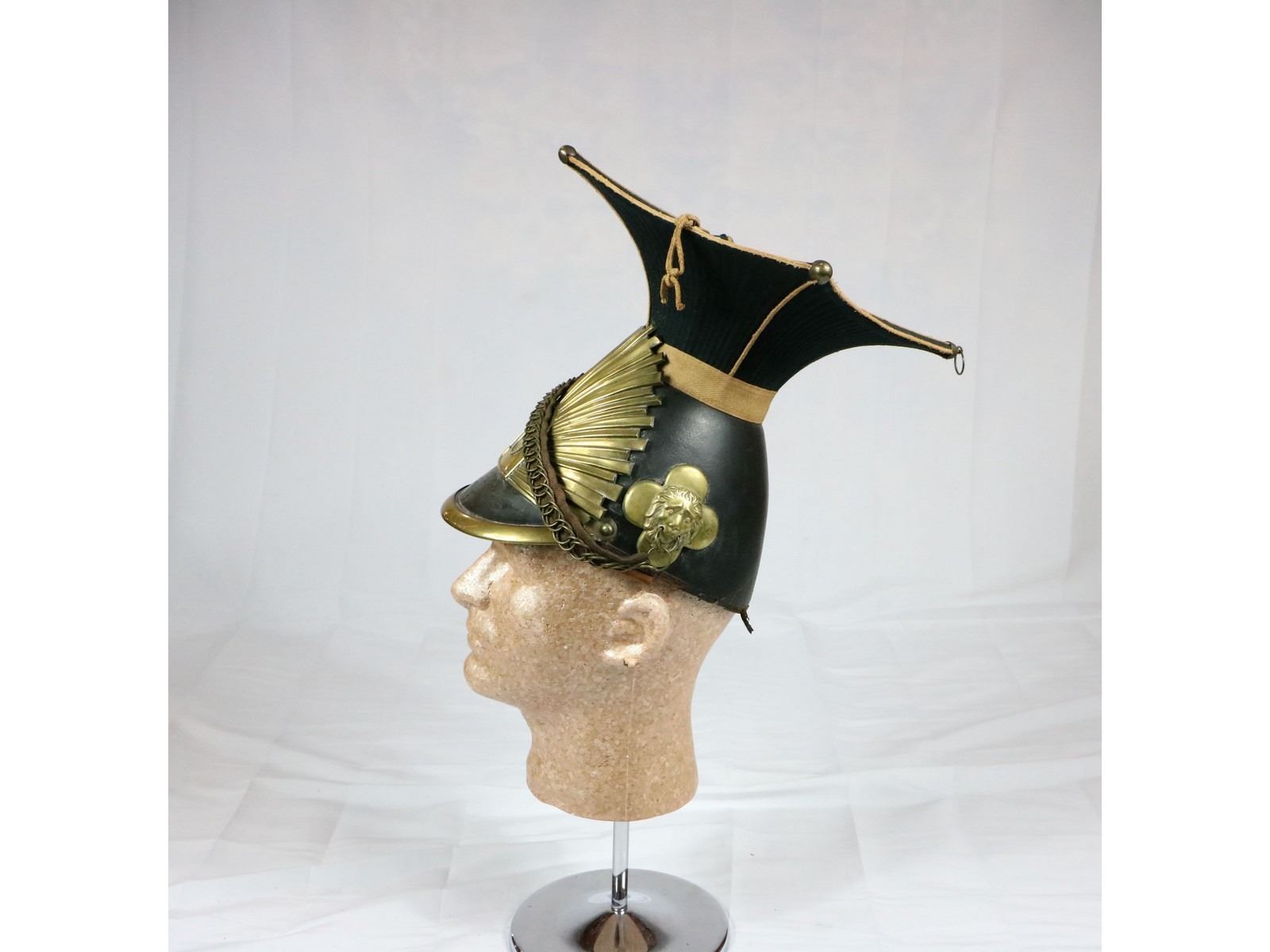 Belgian Lancer Czapka dating late 1700s to early 1800s. The Czapka was first worn by Austrian forces in 1784 and continued to be in service by German, Austro-Hungarian, Belgian, and Russian lancers until the middle of WWI. Some French units also wore a similar design during the Napoleonic wars. Lancers were cavalry units that fought with little to no armor and wielded lances. This helmet belonged to the 10th Belgian regiment. Leather trim is damaged on both sides. Chin straps are in good shape. Overall good condition. Must see photos.