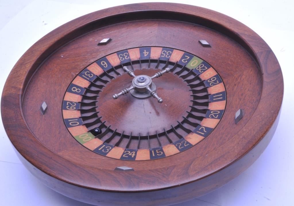“00” and “0” (Post 1900). Measures 16” across and 4 ¼” in height. Casino quality with jointed and select wood. Works nicely. Very collectible and about 100 years old. In good condition plus. Est.: $500-$1000