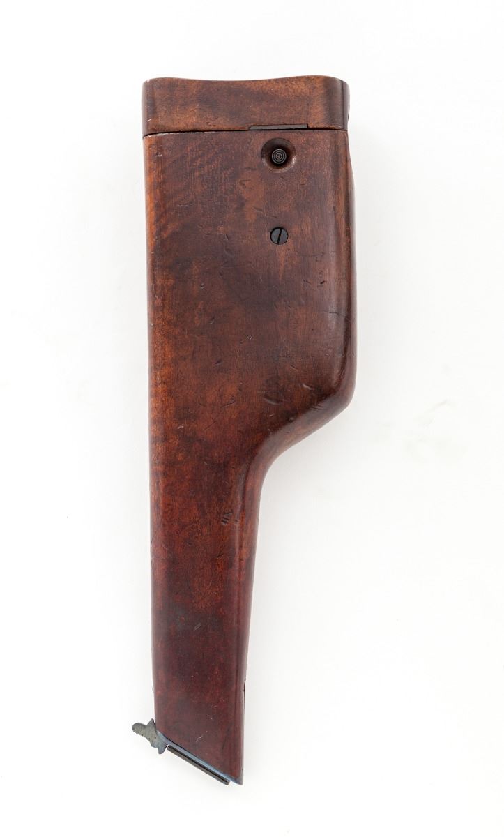 Early 9mm Export Mauser C96 Broomhandle Semi-Automatic Pistol, with Mauser marked unnumbered combination shoulder stock/holster, #62113, 9mm, 5-1/2'' barrel, blue finish with straw trigger, fire blue extractor and rear sight assembly, 12-groove walnut grips. Condition is excellent as professionally restored, retaining approx. 98% blue/black finish. Grips show light wear. Action is good, bore is bright. Shoulder stock with light restoration over minor scuffs and scratches. Est.: $1,200-$1,800. (C&R)