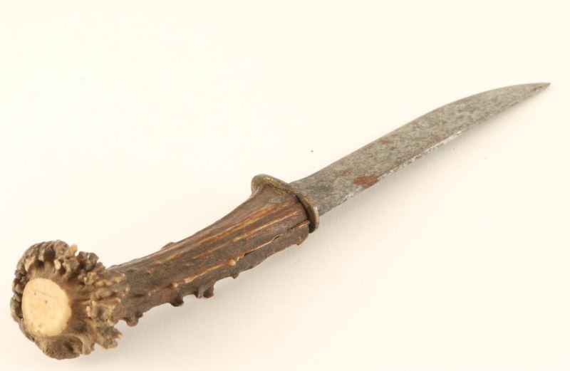 Stag grip and thin steel blade, circa 1800-1830s. Measures 8 3/4" overall with a 4 7/8" blade. Pitting and rust on blade. Good overall. Type mountain men would have carried for patch cutting, utility and self defense.
