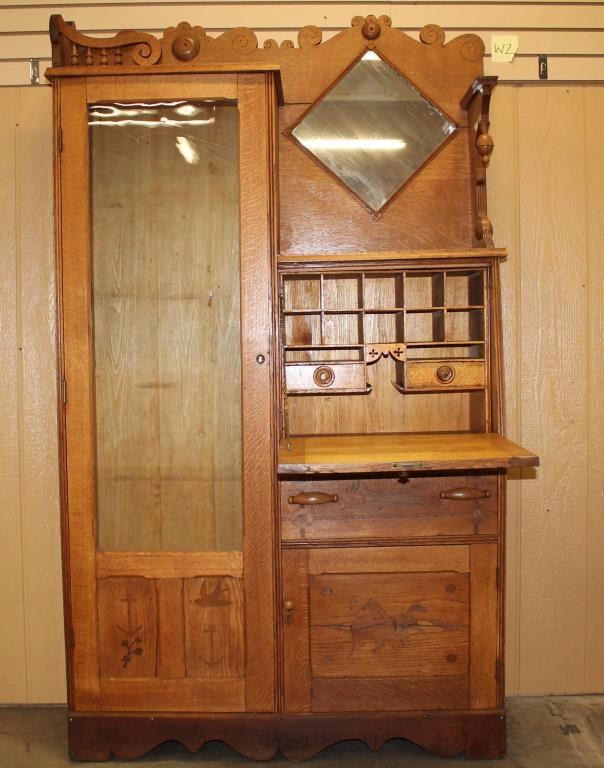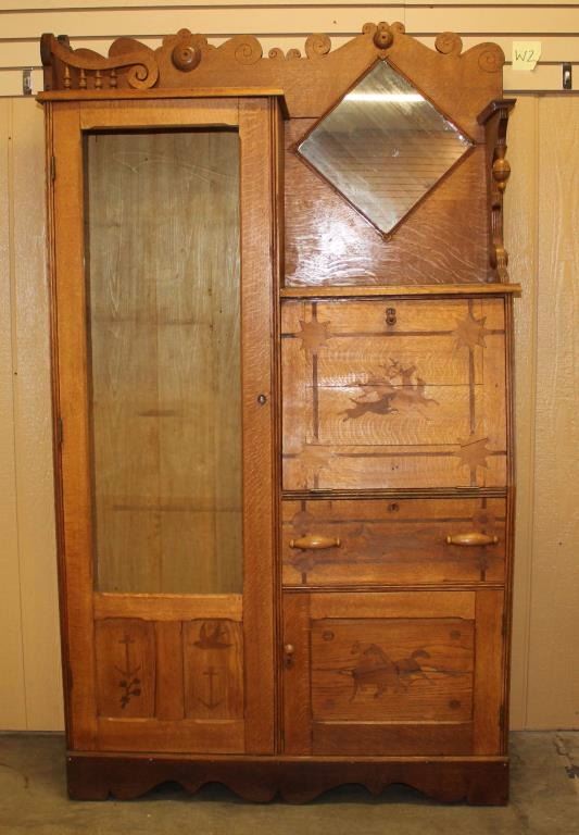 Solid oak with inlaid elk, horses, birds, anchors and stars. Drop down secretary with several compartments for mail. Below this is lower gallery cabinet, on left side there is a glass front cabinet used for display, back has diamond shaped mirror. Shows age as it has some cracking to wood in scattered areas, some damage to left side. Victorian era, measures 73"x43"x15".