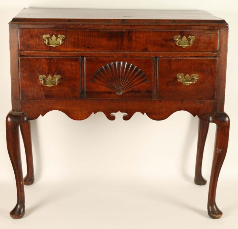 Front of sideboard has two drawers with a carved fan motif with brass hardware. Nicely scalloped edge with curved legs and rounded feet. Shows age and use. Measures 38" x 37" x 19".